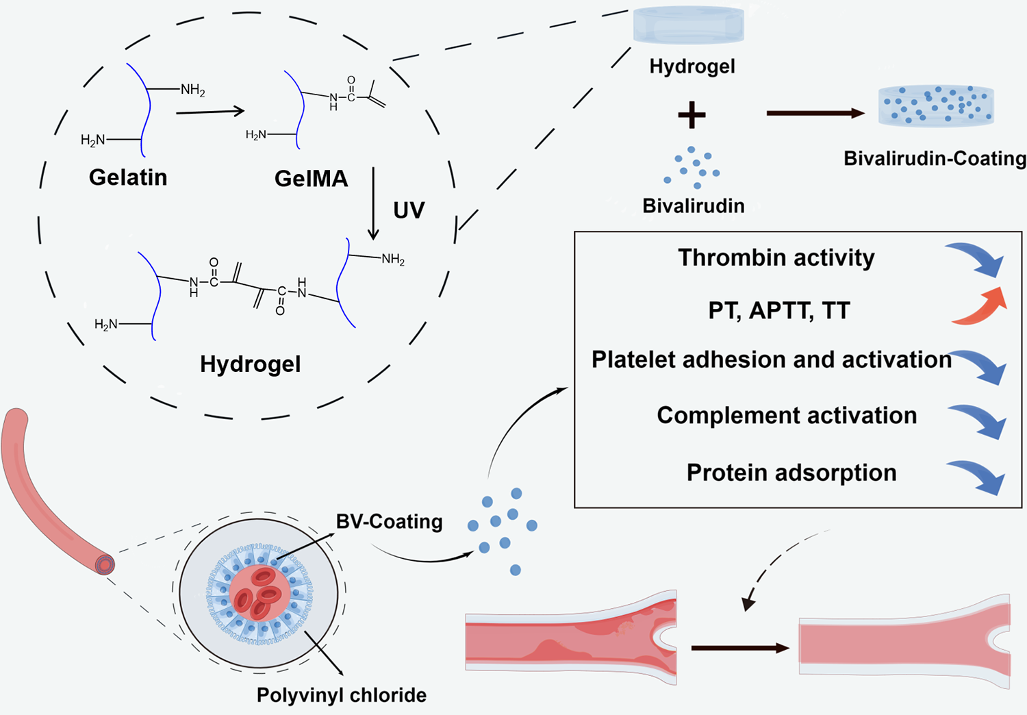 As an anticoagulant material, the application of heparin coating was limited by the potential risk of complications such as HIT and essential hemorrhage. Given its shorter drug metabolism and more precise mechanism of action, BV could hold more significant potential for application in tube coating technology. The BV-Coating of the GelMA hydrogel tube was successfully synthesized and substantiated its good biocompatibility and surface anticoagulation. Compared with intravenous injection, BV hydrogel coating does not significantly alter the overall coagulation level, which can prevent complications such as systemic bleeding while promoting the treatment process. The GelMA hydrogel coating technology represents a design strategy that mitigates the risk of thromboembolism associated with using blood-contacting medical devices.