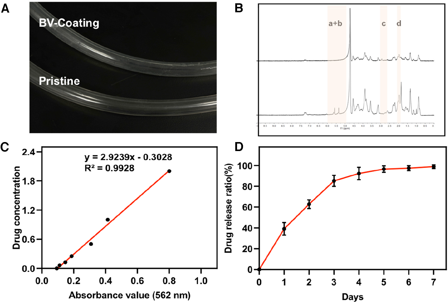 GelMA synthesis and drug release. (A) The image of GelMA-hydrogel coatings tube and prisitine tube. (B) Proton nuclear magnetic resonance (1H-MNR) spectra of gelatin and GelMA. (C) Standard curve of ultraviolet absorption of BV at 562 nm. (D) Performance test of drug release from BV-Coating within 7 days.