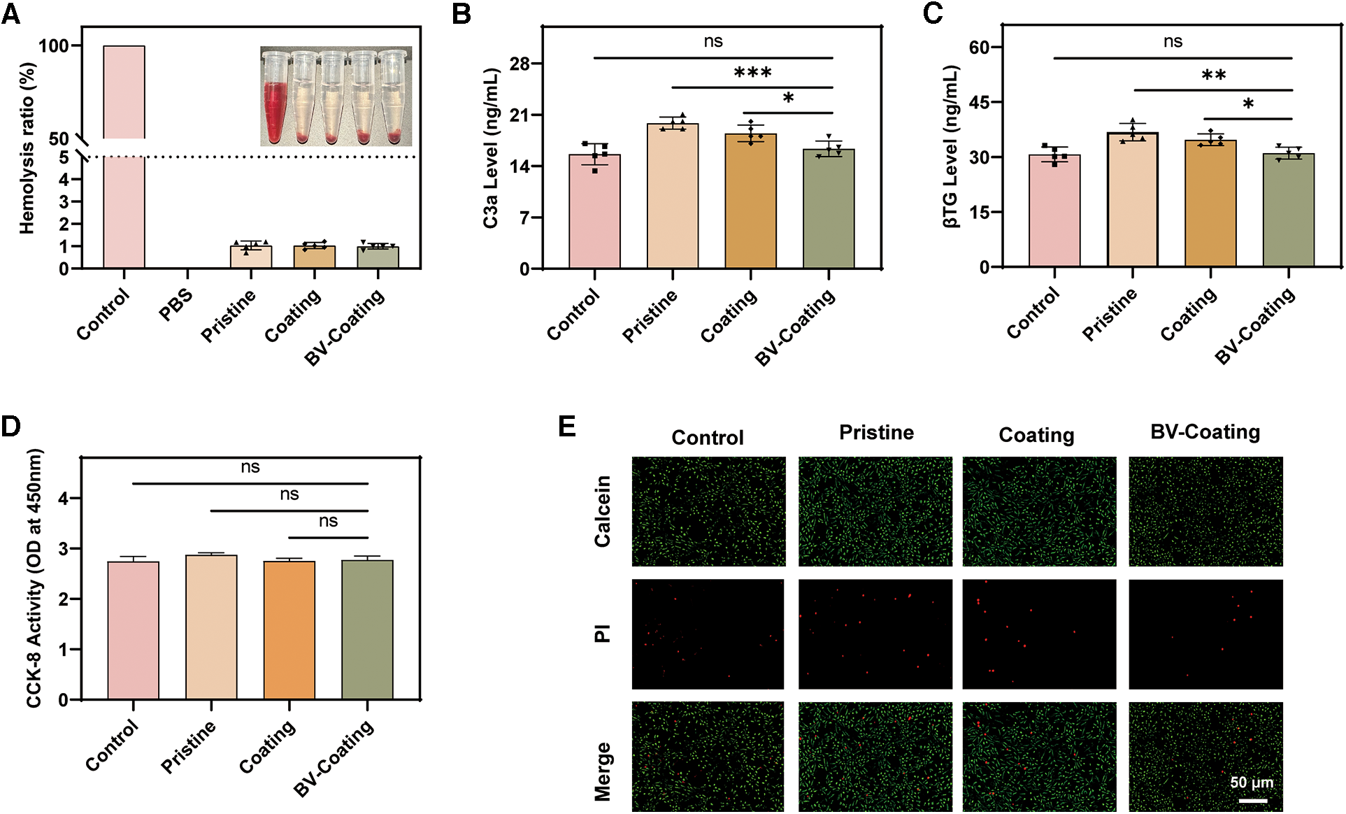 In vitro biocompatibility assay. (A) Hemolysis analysis; (B) Complement activation level index of C3a; (C) Platelet activation indicator level of β-TG; (D) Cytocompatibility; (E) Cell viability. (****P < 0.0001; ***P < 0.001; **P < 0.01; *P < 0.05; ns, not significant).