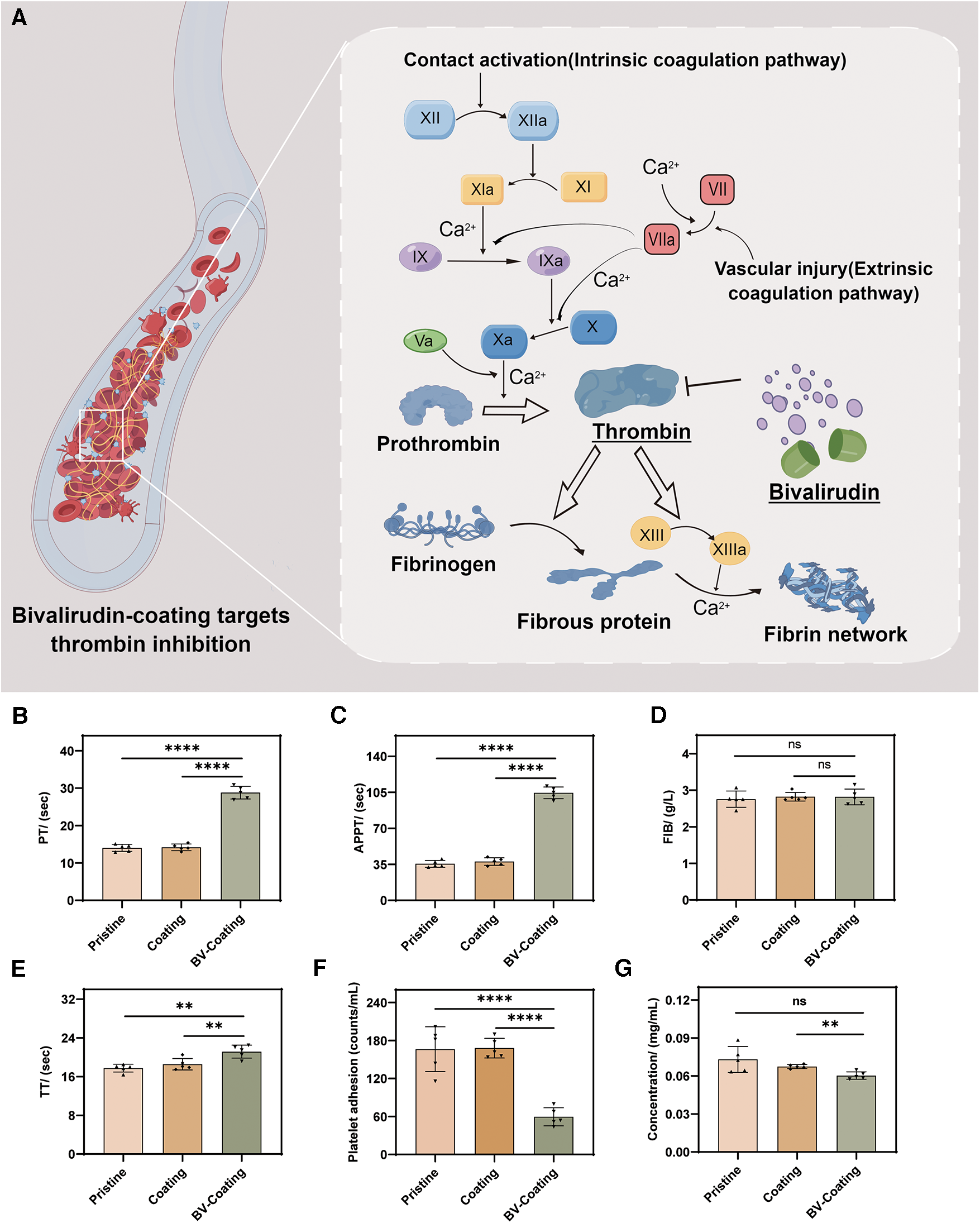 In vitro anticoagulant properties assay. (A) Schematic diagram of BV targeting thrombin; (B) PT activity; (C) APTT activity; (D) FIB activity; (E) TT activity; (F) Platelet adhesion assay; (G) Protein adsorption assay. (****P < 0.0001; **P < 0.01; ns, not significant).