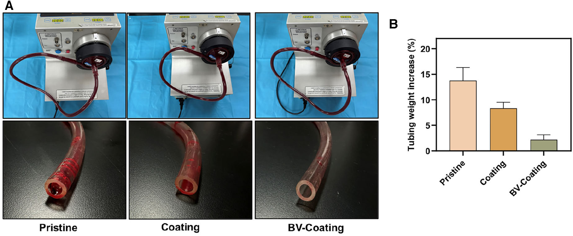 In vitro blood loop tests of dynamic blood. (A) Image of circulation condition and tubes after flow testing; (B) The occlusion rate of tubes after circulation of dynamic blood.