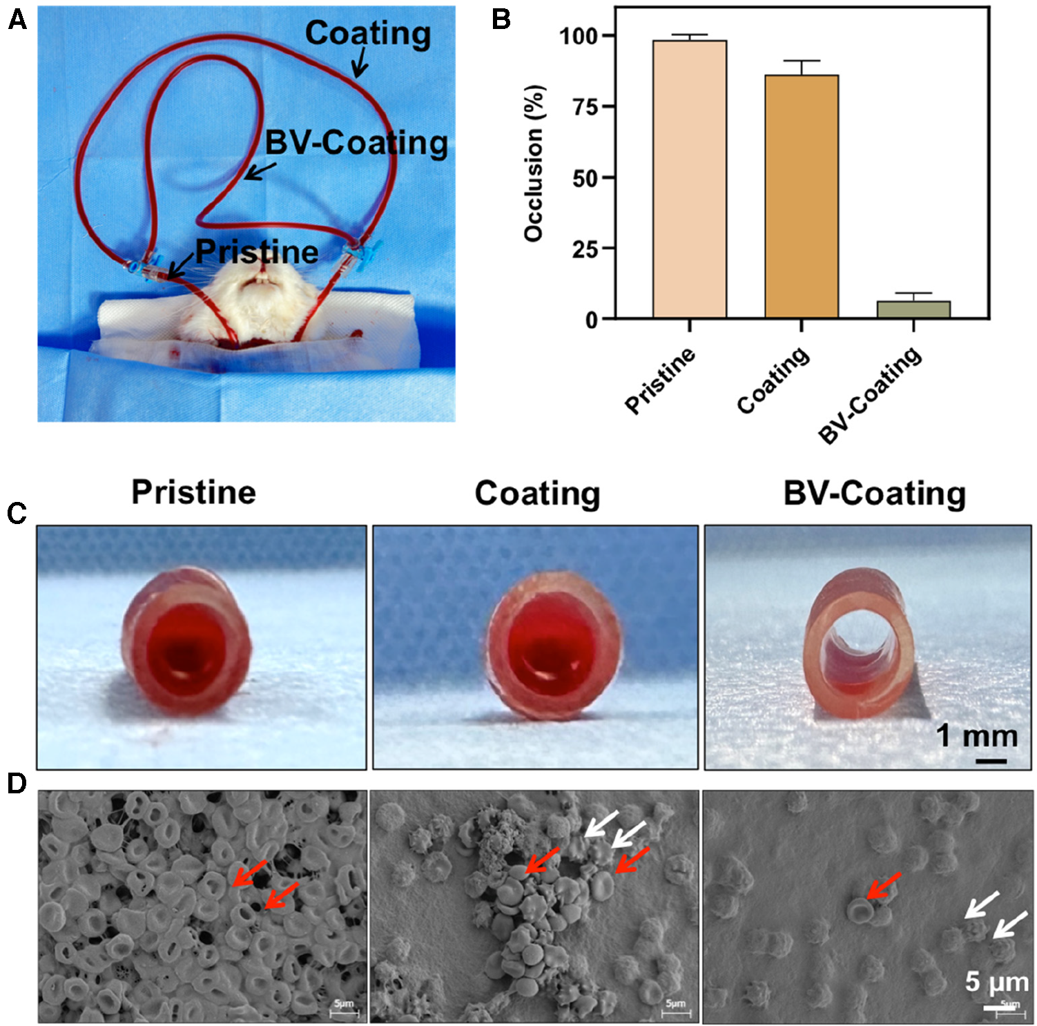 In vivo antithrombogenicity assay. (A) Schematic diagram of the arteriovenous shunt model; (B) Quantification of blood clotting adhesion to the tube walls after circulation; (C) The image of the pristine tube, GelMA-hydrogel coatings tube, and BV-Coating GelMA hydrogel tube after circulation. (D) Electron microscopy images of pristine tube, GelMA-hydrogel coatings tube, and BV-Coating GelMA hydrogel tube after circulation, red arrows indicate erythrocytes, white arrows indicate activated platelets.