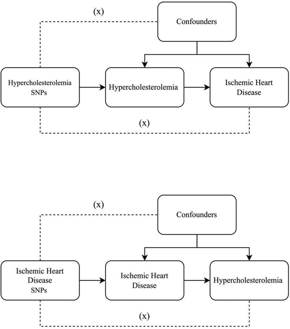 The chief contributors to hypercholesterolemia include an excessive biosynthesis of cholesterol and/or inadequate clearance of it. It's noteworthy that hypercholesterolemia amplifies the risk for developing atherosclerosis and ischemic heart disease (10). Although hypercholesterolemia's role as a significant risk factor for IHD is widely recognized (11), the suggestion of a causal relationship flowing in the opposite direction—that is, IHD potentially instigating the onset of hypercholesterolemia—presents a less conventional perspective. This concept implies a bidirectional causality between hypercholesterolemia and IHD, a process that warrants meticulous exploration. In our quest to decipher the causal link between the two, we employed an approach known as Mendelian randomization (MR). MR leverages genetic variants as instrumental variables tied to an exposure, consequently amplifying the dependability of the causal inference connecting an exposure and its subsequent outcome. This method helps to address potential challenges such as confounding factors and reverse causality (12, 13). If there exists a causal relationship between the exposure and the outcome, genetic variations influencing the exposure will likely affect the outcome as well. MR is akin to a natural randomized controlled trial, being based on Mendel's second law. This law proposes that alleles from distinct genes are assorted independently during gametogenesis. Consequently, the underlying premise of Mendelian randomization analyses is that the inheritance of a particular trait should remain independent of the inheritance of any other traits (14).