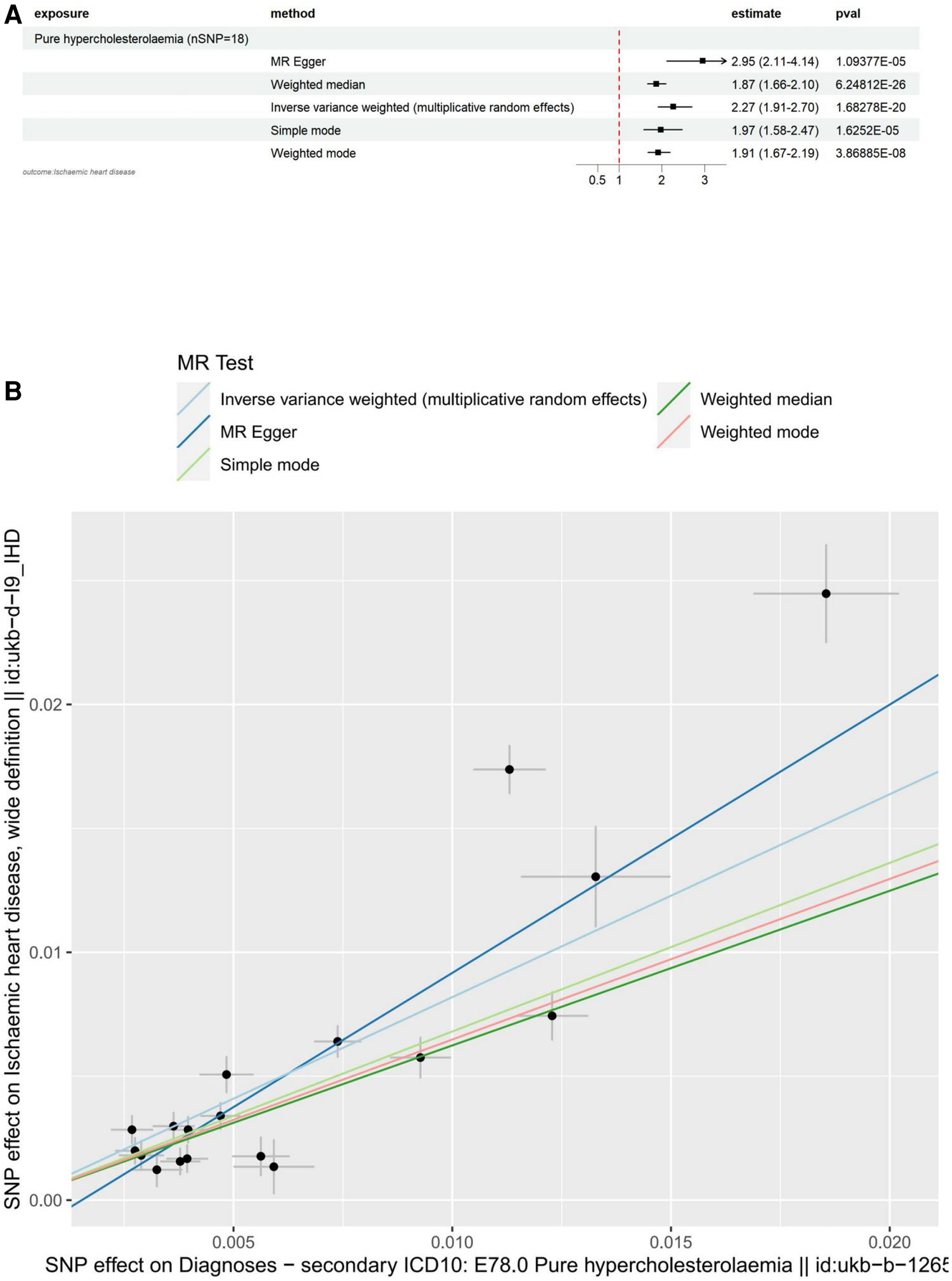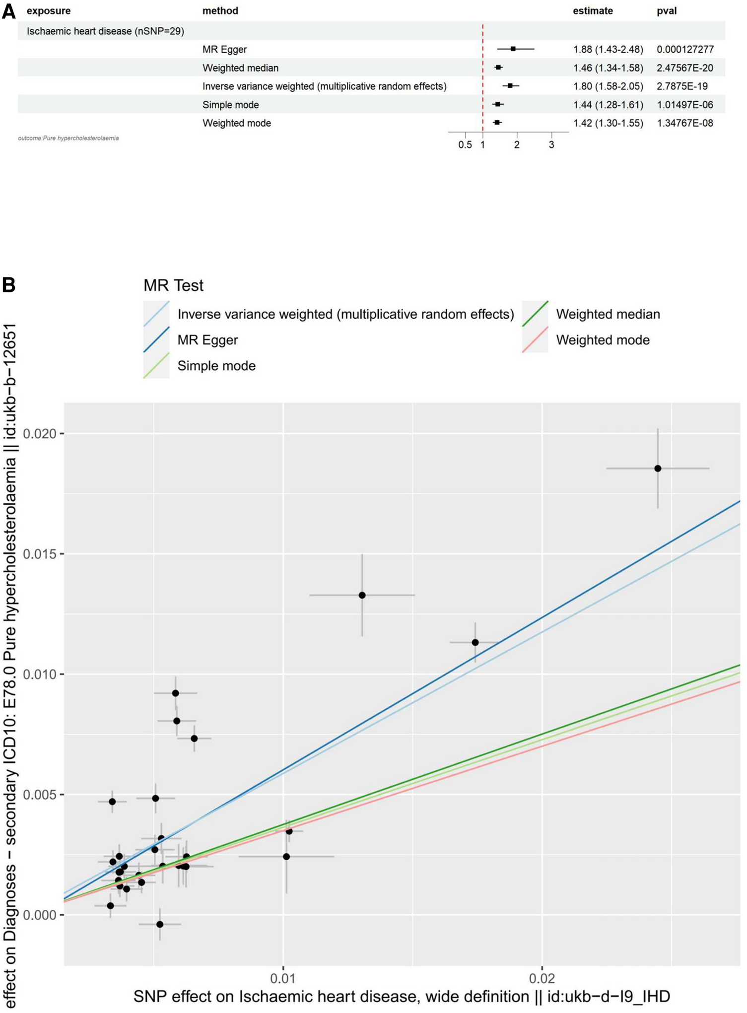 In this study, we conducted a MR analysis to investigate the causal relationship between hypercholesterolemia and ischemic heart disease. We employed five MR methods, including MR Egger, Weighted Median, IVW, Simple Mode, and Weighted Mode, to obtain robust estimates of causal effects. All SNPs utilized in this study exhibited F statistics exceeding 10, indicating robust instrumental variables.