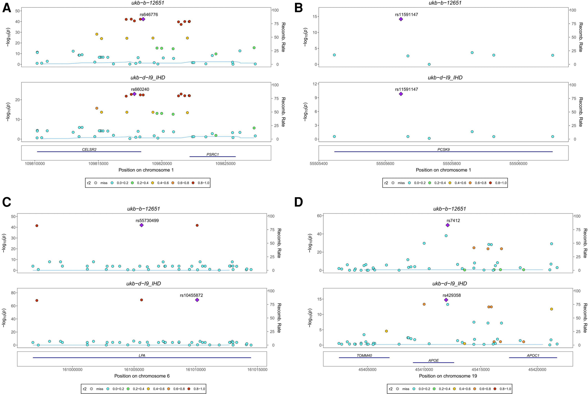 Stacked regional association plot. (A) CELSR2, located on chromosome 1, encodes a transmembrane protein involved in cell adhesion and lipid metabolism regulation, with SNP rs646776 associated with Pure hypercholesterolaemia and SNP rs660240 associated with IHD. (B) PCSK9, also located on chromosome 1, encodes a proprotein convertase that regulates LDL receptor expression. It is associated with SNP rs11591147 for both Pure hypercholesterolaemia and IHD. (C) LPA, located on chromosome 6, encodes lipoprotein(a) involved in cholesterol metabolism and is associated with SNP rs55730499 for Pure hypercholesterolaemia and SNP rs10455872 for IHD. (D) APOE, located on chromosome 19, encodes apolipoprotein E, a key player in lipid metabolism. It is associated with SNP rs7412 for Pure hypercholesterolaemia and SNP rs429358 for IHD.