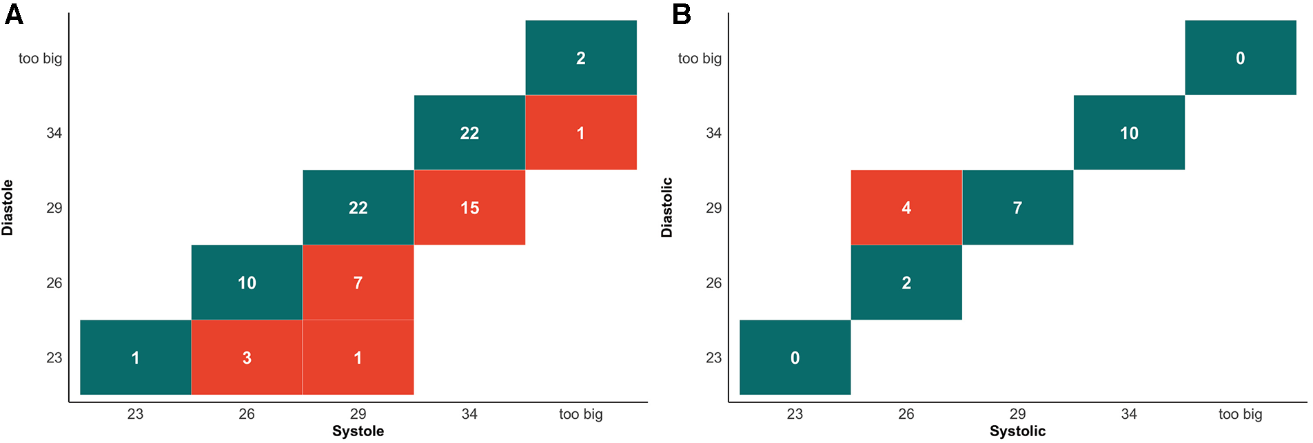 As demonstrated in Table 3 and Supplementary Figure S1, the variation in annular dimensions across the cardiac cycle in patients with AR resembles that in patients with AS. Specifically, the annular diameter progressively enlarges from mid-systole to early diastole yet gradually diminishes during mid-diastole. Notably, in the case of AR, 86% (25/29) of the patients exhibited a larger annular dimension during systole. Likewise, in AS patients, 85% (22/26) demonstrated a larger systolic annular diameter. As illustrated in Supplementary Figure S2, paired t-tests revealed significant differences between the systolic and diastolic annular dimensions regarding both annular circumference and area. Interestingly, no significant differences were observed between the 20% and 30% phases or the 70% and 80% phases of the cardiac cycle. Intriguingly, the annular dimensions at the 50% phase also showed no significant differences compared to the 70% and 80% phases.
