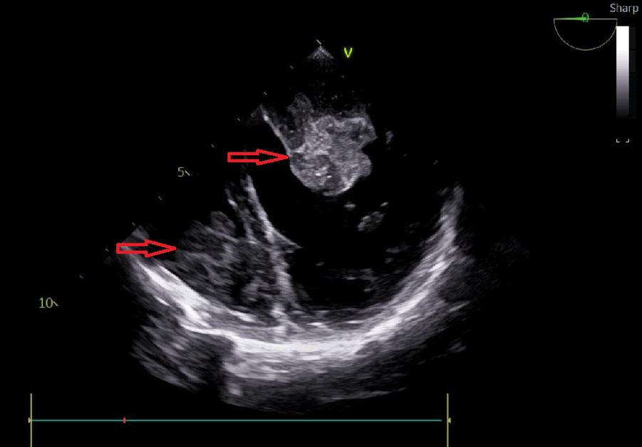 Transesophageal echocardiography, the mass shadow at the arrow is myxoma.