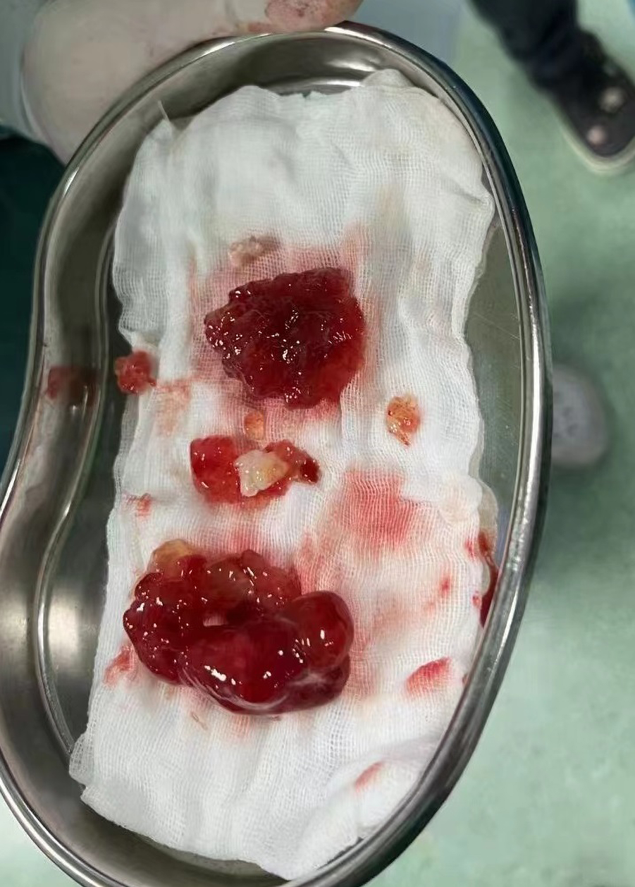 The red jelly-like substance in the bowl is the tissue of myxoma removed by surgery.