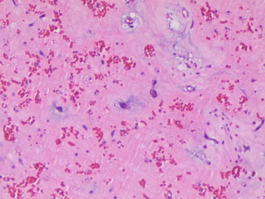 Sections under microscopic examination showed that the tumor cells are scattered in the myxoid matrix, star-shaped and polygonal, diffuse or intertwined into a network, and the focal area bleeds.