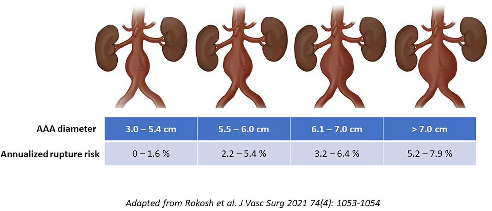 Notably, there is significant overlap among covariates that contribute both to AAA growth and rupture risk. The strongest predictors include smoking exposure (relative risk increases 3–5-fold) and family history (RR∼2-fold) (8). Additional variables such as oxygen-dependent COPD, coronary artery disease, hypertension, cerebrovascular and peripheral artery disease, as well as mixed connective tissue disorders all have associations with the natural history of AAA (9). Notwithstanding the impact of these other biologic factors that have been implicated in AAA morbidity, to date, diameter remains the single most important predictor that is used to inform perioperative rupture risk assessments. It is important to highlight that historical estimates for diameter-associated rupture risk are now recognized to have been overestimated since they were predominantly based on retrospective observations, as well as autopsy studies. This point is highlighted by the recently published North American Society for Vascular Surgery's updated guideline implementation document (10). Specifically, a 5.5 cm diameter for a man now has an endorsed annualized rupture risk of −1%–3% (which is less than the −5%–6% that was commonly espoused previously). Similarly, a 6.0 cm AAA has an approximately 3%–6% risk of rupture per year which is roughly half of what was reported in historical guidelines and series (Figure 1) (10). These revised estimates may have clinical implications surrounding recommended diameter thresholds for surgical repair.