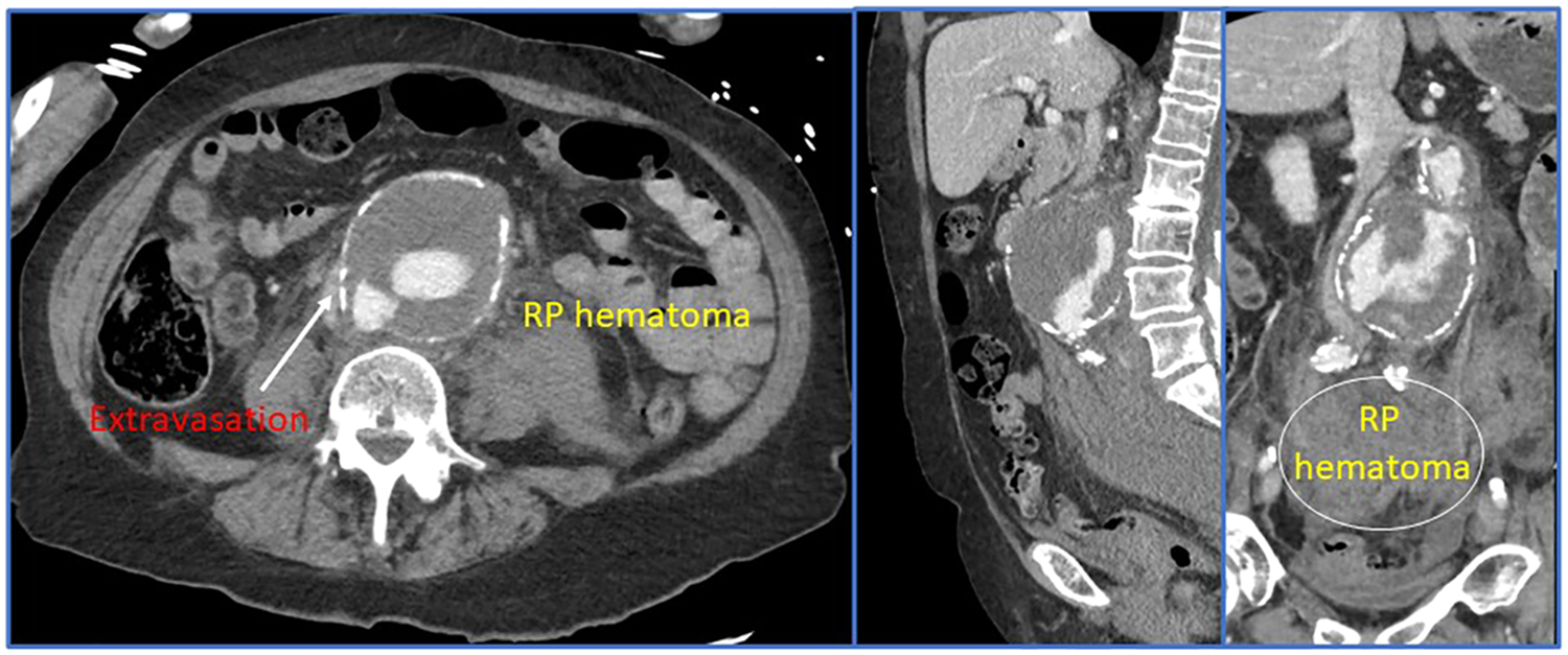Some of the most important advancements in the modern management of rAAA can be linked to improvements and innovation in preoperative and intraoperative imaging. The gold-standard for imaging is thin-sliced (<1.0 mm) computed tomographic angiography with reformatted images (Figure 3). Most modern healthcare systems across different nations now have access to these scanners and the authors consider it mandatory that patients have a CTA before arrival to the operating room. This remains true even in the hemodynamically unstable patient—since without appropriate imaging, the aneurysm extent, associated morphology, and assessment of the paravisceral aorta would be unknown. Blindly operating on a rAAA that was diagnosed using point-of-care ultrasound is not recommended especially since delineation of relevant anatomic characteristics informs the operating surgeon about the optimal treatment modality and surgical approach (e.g., open vs. endovascular repair; if open, retroperitoneal vs. transperitoneal, etc.). Rapid imaging acquisition times now permit obtaining this vital anatomic information with minimal delay toward operative repair. However, we concede that there are some centers (29) who will allow patients with rAAA to proceed to the operating room without a CT scan and may achieve good results. Irrespective of what imaging bias is employed, an efficient care system is required to ensure timely delivery of the patient to the operating theater.