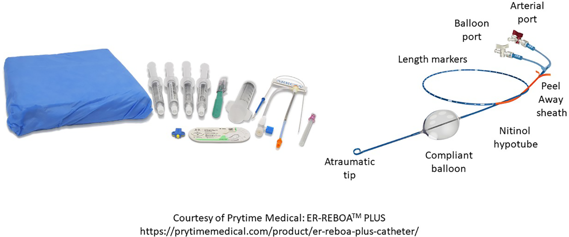 Upon arrival to the operating room, the attending surgeon and anesthesiologist need to have a clear plan about the timing of anesthetic induction since hemodynamic collapse can occur when general anesthesia is instituted. Accordingly, it is the author's recommendation that endotracheal intubation not occur until the patient is adequately positioned with appropriate lines placed and the operative field is established (e.g., “prep and drape” the awake patient). Surgeon preference dictates use of resuscitative endovascular balloon occlusion (e.g., ‘aortic balloon occlusion or REBOA; Figure 4) which can facilitate either open or endovascular repair (see aortic balloon occlusion section below). Moreover, this can be placed under local anesthesia prior to induction of general anesthesia should hemodynamic instability ensue. Subsequently, as the operation progresses, communication between the anesthesiologist and vascular surgeon further informs needs to escalate resuscitation depending on the hemodynamic, rheologic, thermodynamic and coagulopathic state of the patient.