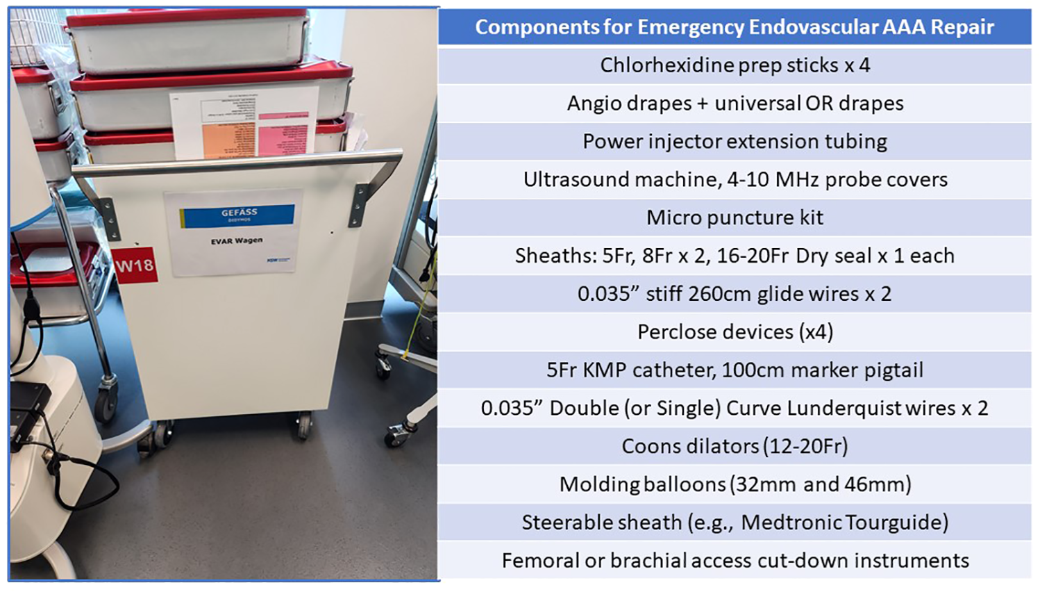 Many centers now employ EVAR as their preferred treatment strategy for rAAA patients (15, 32, 33). Eligibility for endoluminal management usually can be assessed using the preoperative CT imaging (Figures 3, 5). Various series have identified that when using “extended anatomic criteria”, approximately 60%–70% of rAAA patients qualify for EVAR. Inflection points to consider in the decision-algorithm about whether or not to employ a stent-graft are influenced by the aortic neck diameter (e.g., ≤32 mm), infrarenal neck length (e.g., ≥10 mm), as well as β-neck angulation (≤750) (4, 32). Importantly, oversizing principles generally are on the upper end of the 20%-30% spectrum since many patients have hypovolemia and underfilling of their aorta on presentation which should be considered in proximal endograft sizing. Further, in select centers, use of physician-modified EVAR or parallel/chimney stenting techniques has increased the spectrum of patients that are now deemed eligible for emergent EVAR. Given the complexity involved in these cases, having the necessary stent-graft inventory along with the ancillary wires, catheters, sheaths and operative team experience to support use of these technologies is paramount to success. Accordingly, to mitigate case preparation time, many centers now have “rupture kits” (Figure 6) which have all the fundamental endovascular (and open) surgical tools pre-selected and aggregated so that they are ready for rapid deployment.