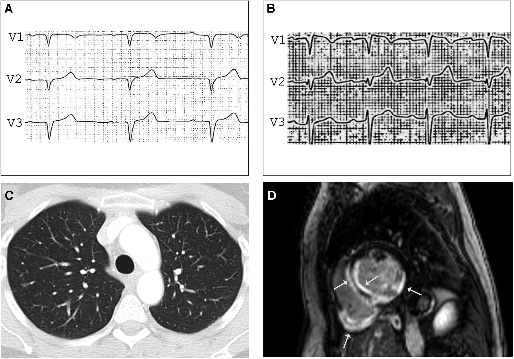 ECG before (A) and after (B) Ajmalin provocation test unmasking coved-type ST segment elevation in V1 suggesting BrS. (C) Contrast-enhanced CT showing small, irregular foci in both lungs compatible with pulmonary sarcoidosis stage 3. LGE CMR frame in short-axis - view (D) revealing subendocardial to intramyocardial LGE in the basal septal and inferolateral LV wall and the entire right ventricular posterior wall (arrows), LVEF was mildly impaired (41%) with normal-sized heart chambers.