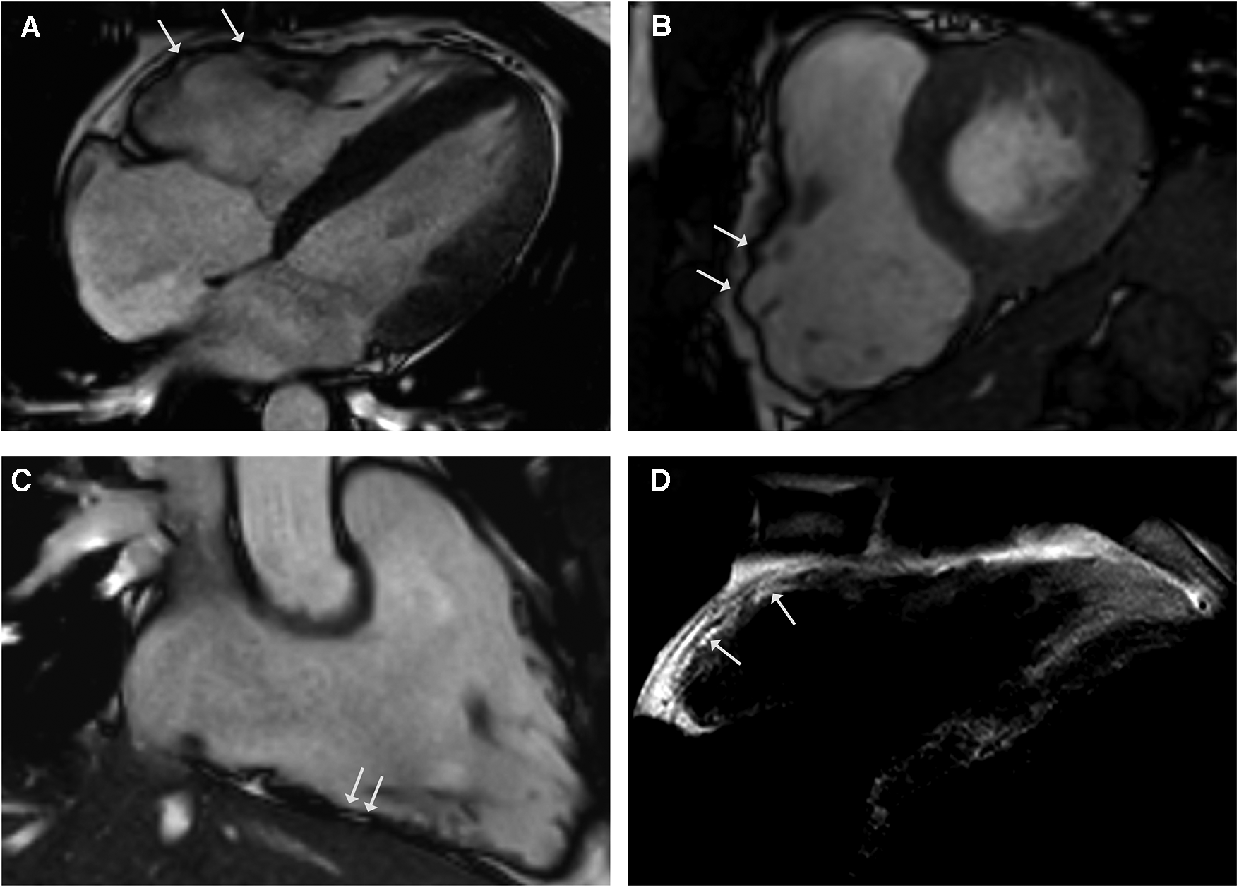 CMR cine images in 4-chamber (A) and short-axis - views (B) revealing right ventricular dilatation with bulging (arrows) and regional dyssynchrony in end-systolic phase. Right ventricular systolic function was mildly reduced (RV EF 42%). CMR 3-chamber view of the RV (C) demonstrating fatty spots. (D) T1-weighted black blood spin CMR showing fatty replacement of the RV free wall.