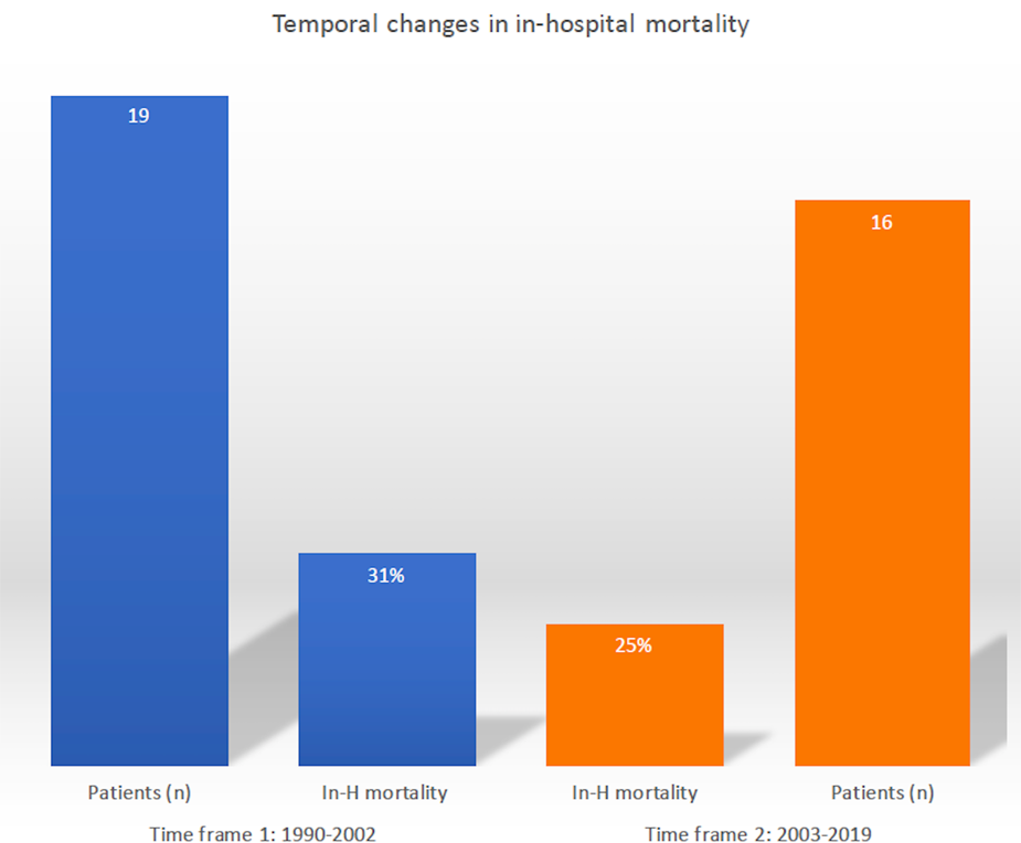 Temporal trend evaluation of in-hospital mortality following post-infarction left ventricular free-wall rupture surgical repair.