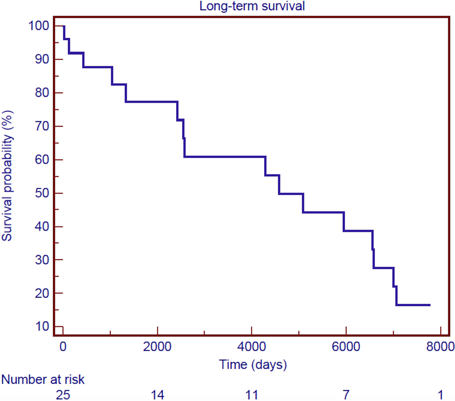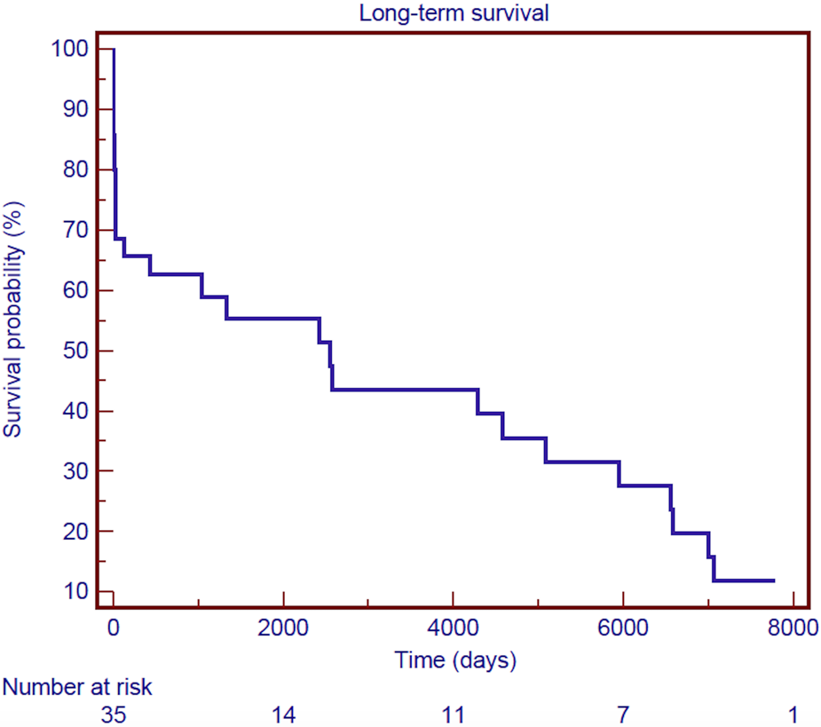 Kaplan–Meier survival curve of overall survival for hospital survivors after surgical treatment of post-infarction left ventricular free-wall rupture.