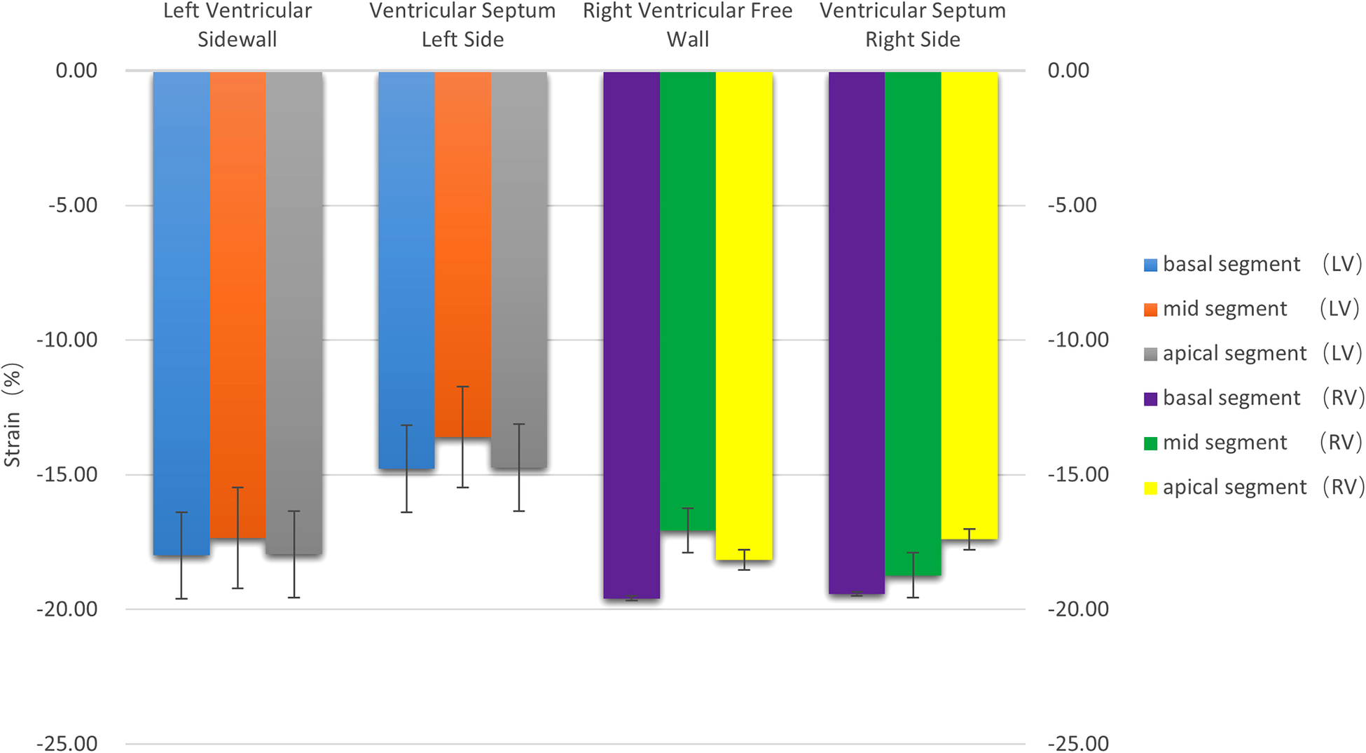 The histogram of the strain of the left and right ventricular walls at each segment. There were no statistically significant differences in the strain between the left and right ventricles (P > 0.05). The strain values were negative.