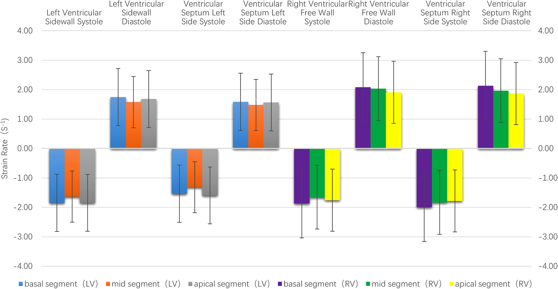 The histogram of the systolic and diastolic velocities of the left and right ventricular longitudinal walls at each segment. The velocities of the left and right ventricles, regardless of lateral wall (free wall) or interventricular septum, show a decreasing trend from the basal segment to the apex segment, in the following order: basal segment > middle segment > apex segment. The differences are statistically significant (P < 0.05). The systolic velocity is a positive value, and the diastolic velocity is a negative value.