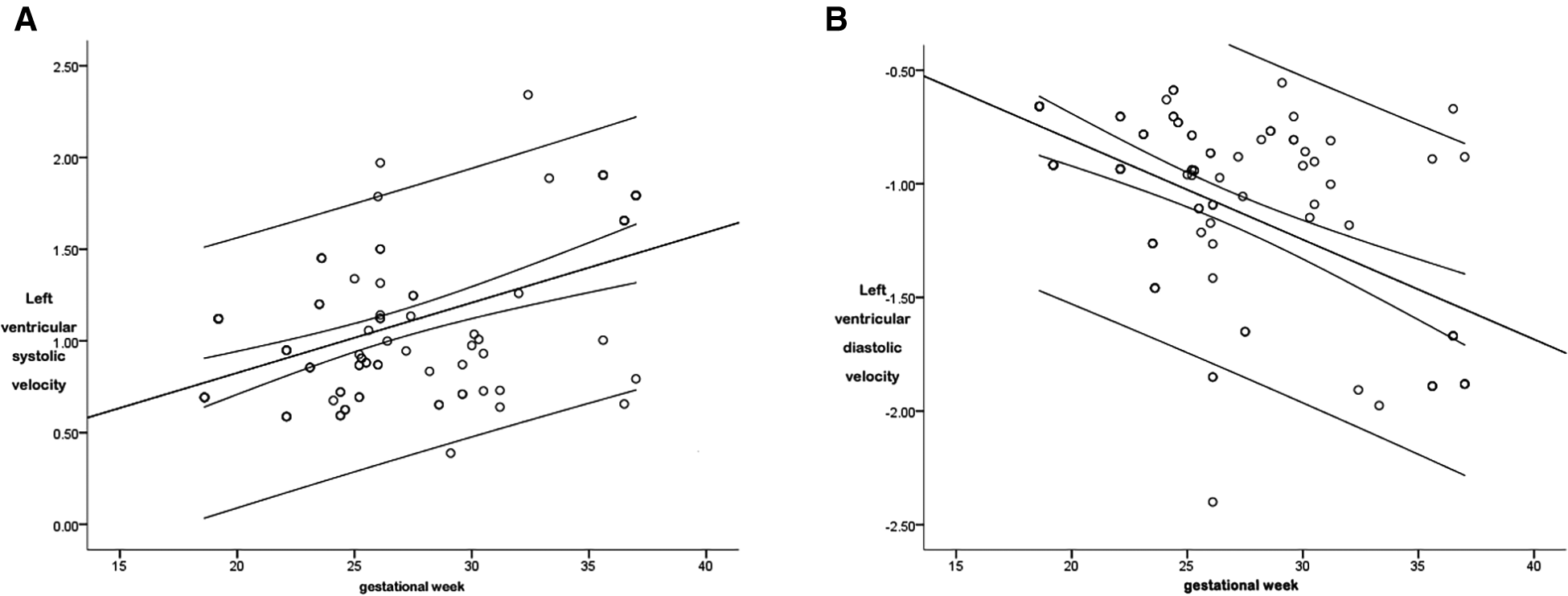 The correlation coefficient (r), between the systolic global peak velocity and the gestational age, was 0.497, and the regression equation was calculated as follows: left ventricular global systolic velocity = 0.061 + (0.038 × gestational age), as is shown in Figure 5A. The regression equation is shown in Table 2.