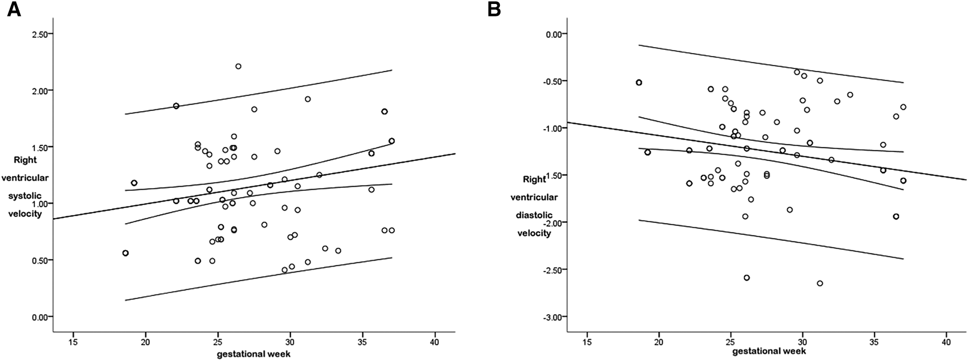 The r between the right ventricular systolic global peak velocity and the gestational age was 0.369, and the regression equation was calculated as follows: right ventricular systolic global velocity = 0.579 + (0.021 × gestational age), as is shown in Figure 6A. The regression equation is shown in Table 2.