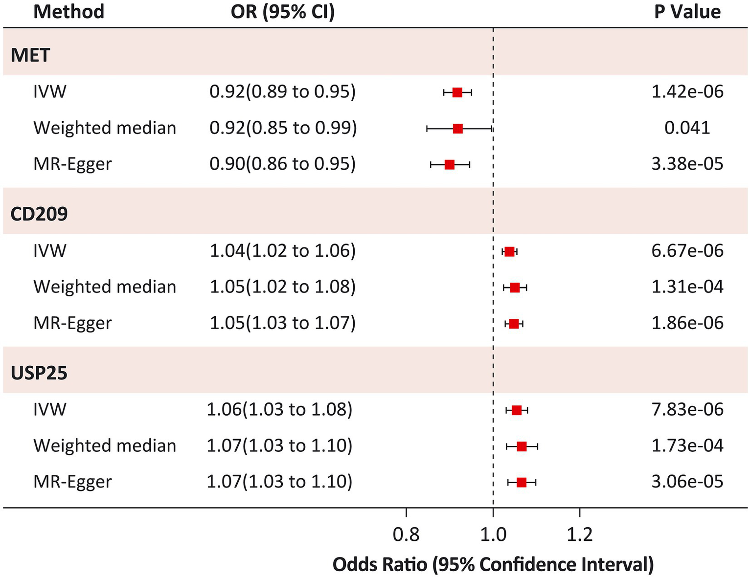 We further investigated the causal effects of MET, CD209, and USP25 on the three relevant outcomes. Genetically predicted MET levels showed consistent associations with CAD (OR: 0.92; 95% CI: 0.86 to 0.98), MI (OR: 0.85; 95% CI: 0.79 to 0.91), and AF (OR: 0.95; 95% CI: 0.92 to 0.98; Figure 1). Genetically predicted levels of CD209 were associated with CAD (OR: 1.05; 95% CI: 1.03–1.07) and MI (OR: 1.07; 95% CI: 1.04 1.10). Genetically predicted levels of USP25 were associated with AF (OR: 1.03; 95% CI: 1.01 to 1.06).