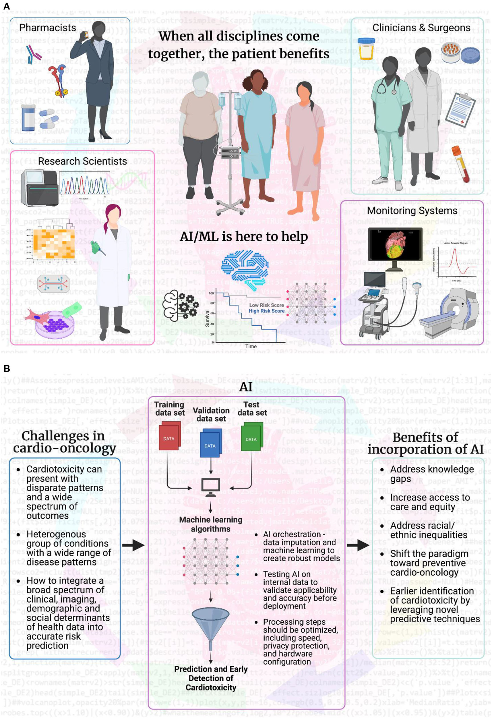 Artificial intelligence and machine learning bridge gaps to make patient care more effective. (A) AI and ML fuel scientific research by analyzing big data from multiple sources: individual patients, healthcare professionals (pharmacists, research scientists, clinicians, oncologists, surgeons, cardiologists, and advanced cardiovascular imaging experts), and imaging/monitoring systems (ultrasound, MRI, CT, PET, and electrophysiology). Clinicians and surgeons are at the forefront of health discussions and can access patient information and fresh or banked samples. AI/ML can analyze imaging beyond visual capabilities and integrate results into the decision-making process for pharmacists and scientists. Pharmacists can incorporate information on patient over-the-counter, pain management, and adherence to prescription medication into AI/ML systems. When combined with patient outcomes, AI/ML can achieve the goal of maximum treatment with minimal adverse effects, even years after treatment is complete. AI/ML can also guide research scientists working behind enemy (disease) lines, to inform experimental design for collected samples, prospectively or retrospectively. AI/ML combines and integrates multiple sources of information with high computing and cloud power to provide a higher level of quality care for each individual patient. (B) The overall flow of how AI/ML can aid in addressing the current challenges facing the field of cardio-oncology and how the incorporation of AI/ML will be beneficial for predictive and early detection, as well as preventive care in cardio-oncology. Created with BioRender.com.