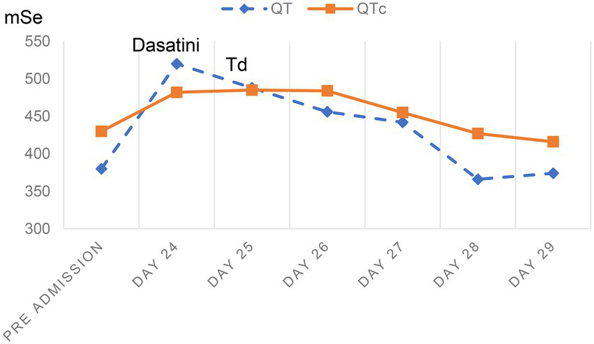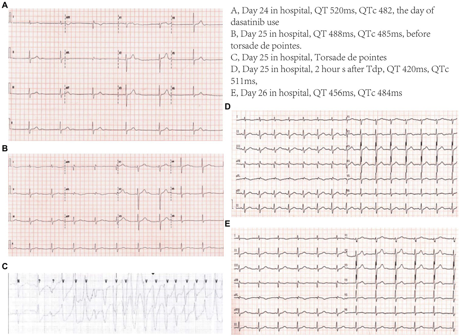 On admission, echocardiography and electrocardiography findings were unremarkable. Antifungals, including micafungin, fluconazole, and antibacterial ceftazidime, were administered intravenously. Approximately 24 days after admission, 100 mg of dasatinib was administered orally. Thereafter, the patient complained of palpitations. Blood pressure was markedly elevated to 204/98 mmHg. The temperature, heart rate, and respiratory rate were 36.5°C, 42 beats per minute, and 15 breaths per minute, respectively. Electrocardiography showed remarkable sinus bradycardia, heart rate of 38 beats per minute, QT interval of 520 ms, and QT correction (QTc) interval of 482 ms (Figure 1). No ST segment deviation and T wave changes were observed. The complete blood count (CBC) was as follows: white blood cell, 7.53 × 109/L; hemoglobin, 115 g/dL; and platelets, 96 × 109/L. His full blood chemistry panel showed slight hypokalemia (3.22 mmol/L, reference level 3.5–5.5 mmol/L) and normal serum creatine and liver enzyme levels. NT-proBNP concentration was 434 pg./mL (reference level is ≤125 pg./mL), and the hyper-sensitive cardiac troponin T (hs-cTnT) level was 22.8 ng/L (reference level < 14 ng/L). The plasma magnesium level was 0.86 mmol/L (reference level = 0.75–1.02 mmol/L). Atropine was administered to increase the heart rate, whereas sodium nitroprusside was administered to decrease the blood pressure. Additionally, oral and intravenous potassium supplements were administered. On the second day, the potassium level increased to 3.68 mmol/L. At 1 p.m., the patient suddenly lost consciousness, and cardiopulmonary resuscitation was immediately initiated. The electrocardiography on the defibrillator showed ventricular fibrillation, and electrical cardioversion was performed simultaneously. The patient regained full consciousness and was transferred to the cardiac intensive care unit. Several episodes of torsade de pointes (Figure 1) were detected on cardiac telemetry monitoring; however, these episodes did not affect hemodynamic stability. Fluconazole and dasatinib were suspected to have induced these hemodynamic changes and were discontinued. Thereafter, intravenous isoproterenol was administered to elevate the heart rate to >90 beats per minute and shorten the QT interval. Aggressive potassium supplements were used to increase the potassium level to >4 mmol/L. Magnesium supplements, including magnesium sulfate and potassium magnesium aspartate, were added. The vicious arrhythmia abated, and the QTc interval gradually returned to 427 ms (QT interval returned to 366 ms) in the 3 days following the event. The longitudinal QT change is shown in Figure 2. Then, 5 days later, hs-cTnT and NT-proBNP levels were 23.4 ng/L and 162.1 pg./mL, respectively. Echocardiography revealed consistent normal left ventricular function. The patient was discharged after prolonged monitoring and duly educated about the prohibited use of certain drugs. Then, 2 months later during follow-up, the patient underwent chemotherapy in another hospital.