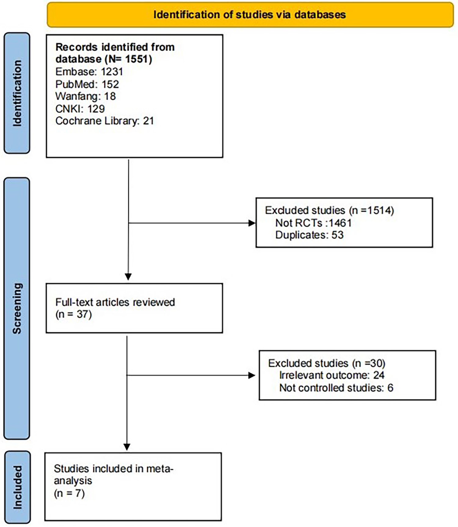 Through the above search method, a total of 1,551 publications were obtained. Upon thorough examination of the abstract and full text, seven articles (11, 14–19) with a total of 4,048 patients were included. The article screening process is shown in Figure 1.