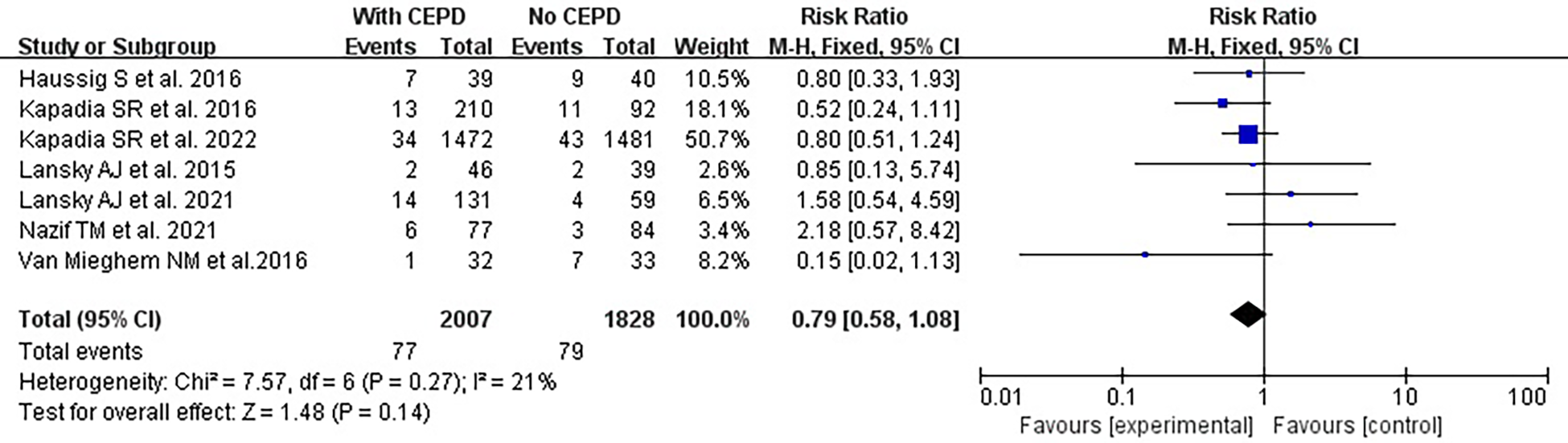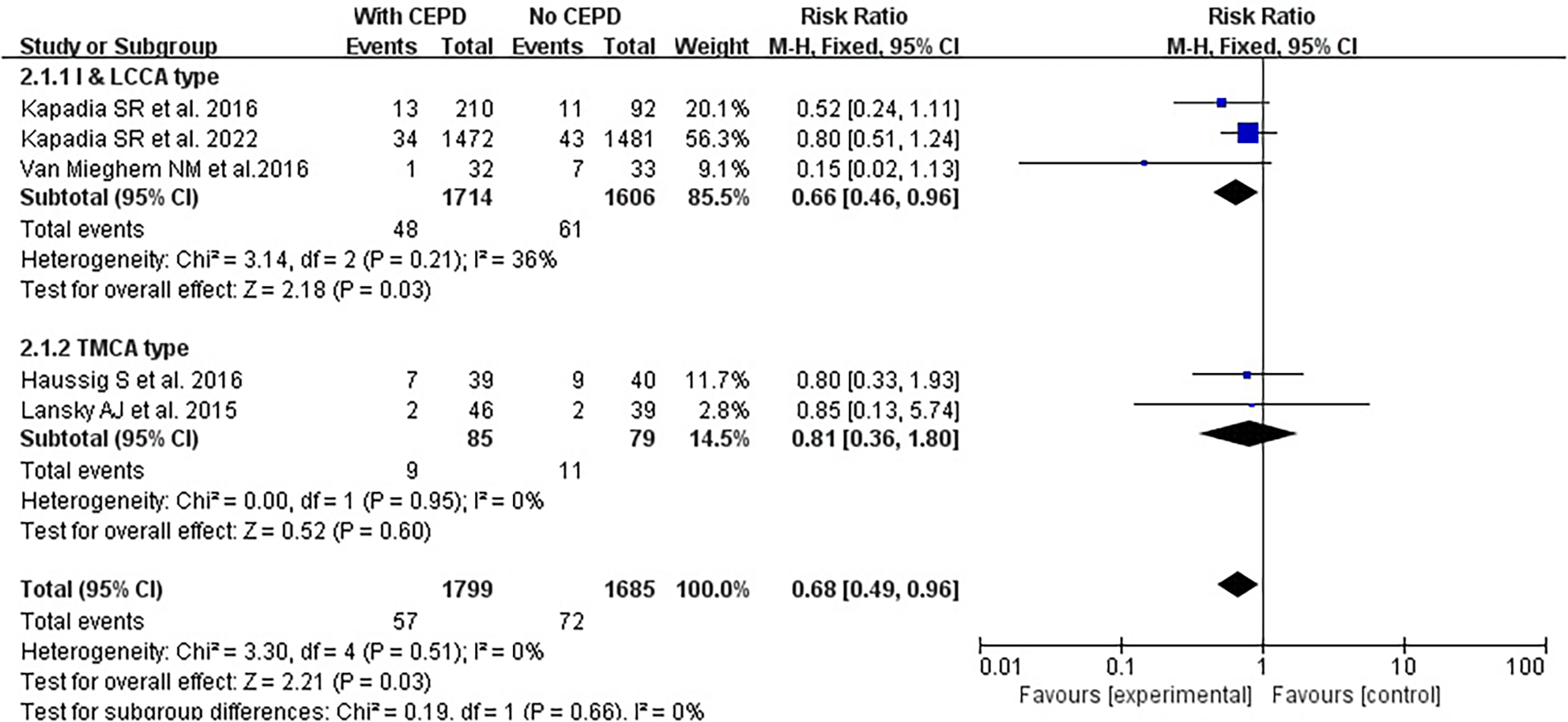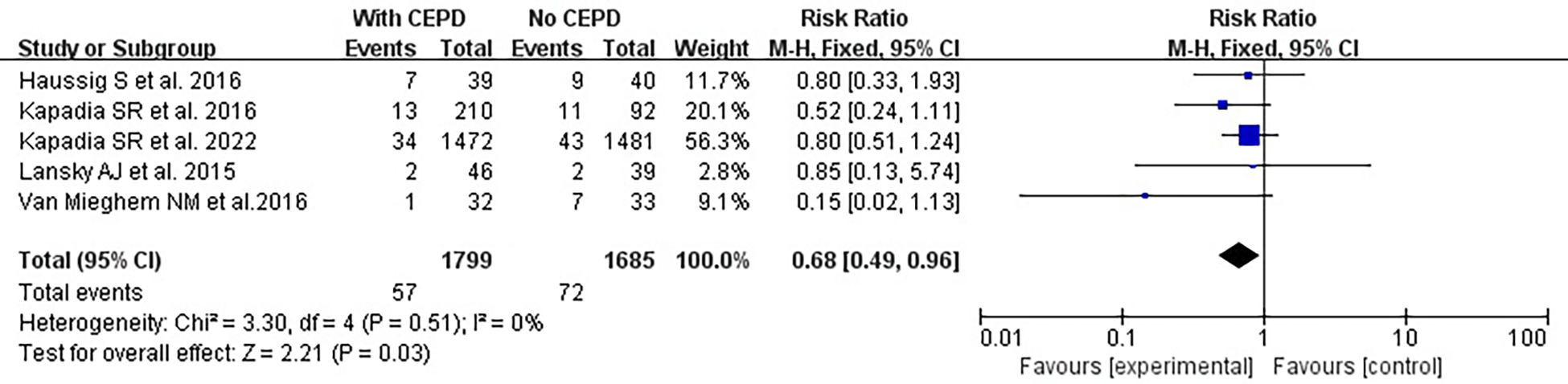 However, due to the misplacement of certain CEPDs or vascular damage observed in the studies conducted by Lansky et al. (17) and Nazif et al. (18), the efficacy of CEPD was decreased and the risk of stroke was increased. Consequently, a high-quality meta-analysis was performed after excluding the two RCTs mentioned above. The risk of stroke was lower in the CEPD group: RR 0.68, 95% CI 0.49–0.96, p = 0.03, I2 = 0% (Figure 5).