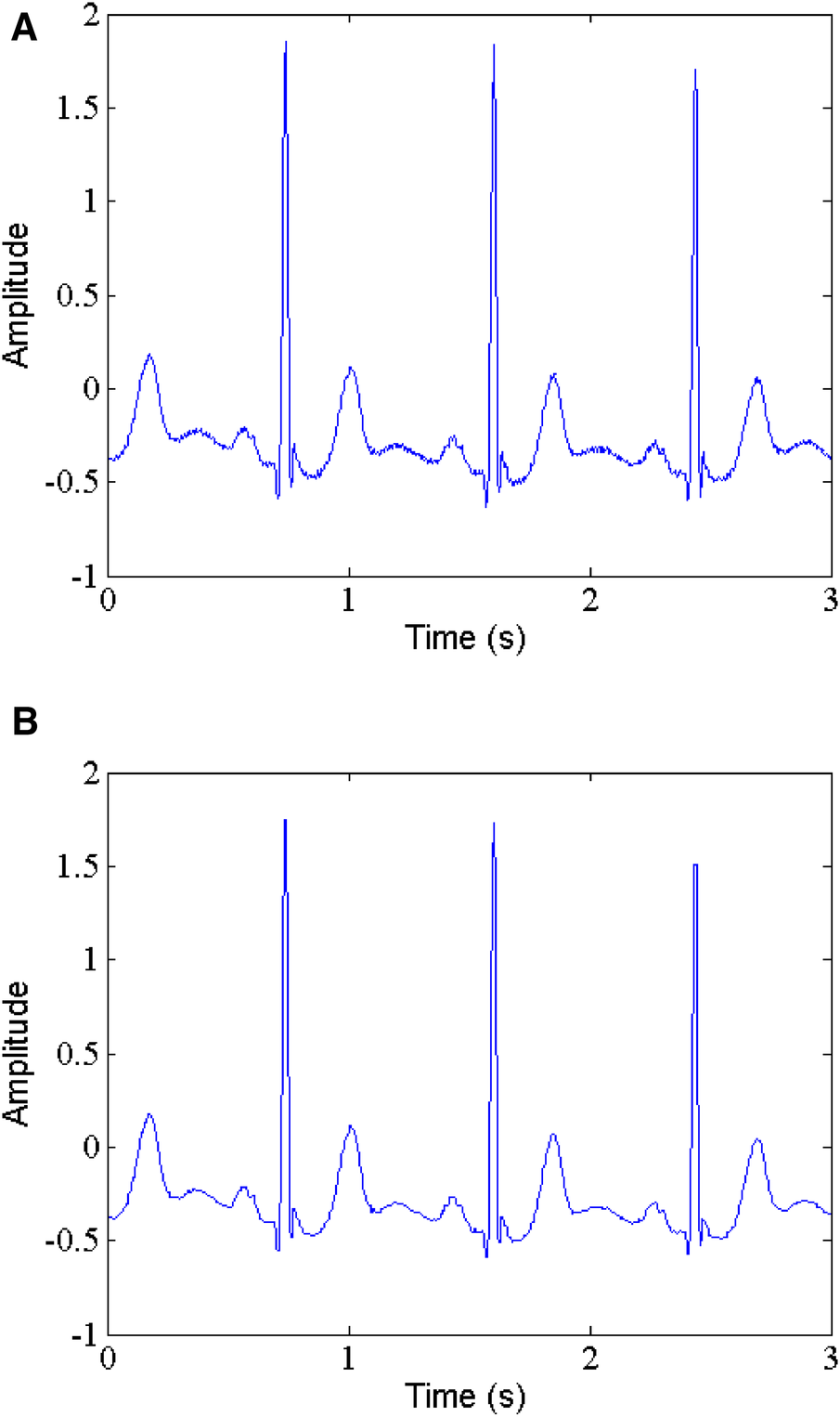 The MIT-BIH arrhythmia database is a well-known publicly available data. It is worth noting that they contain the raw noise, not clean signals. Therefore, in order to evaluate the proposed method more fairly, we first employ median filtering to remove the raw noise. Figure 2 shows the original signal with raw noise (part of record 103) and the corresponding denoised signal by median filtering. As can be clearly seen, the raw noise has been effectively suppressed, thereby facilitating subsequent processing.