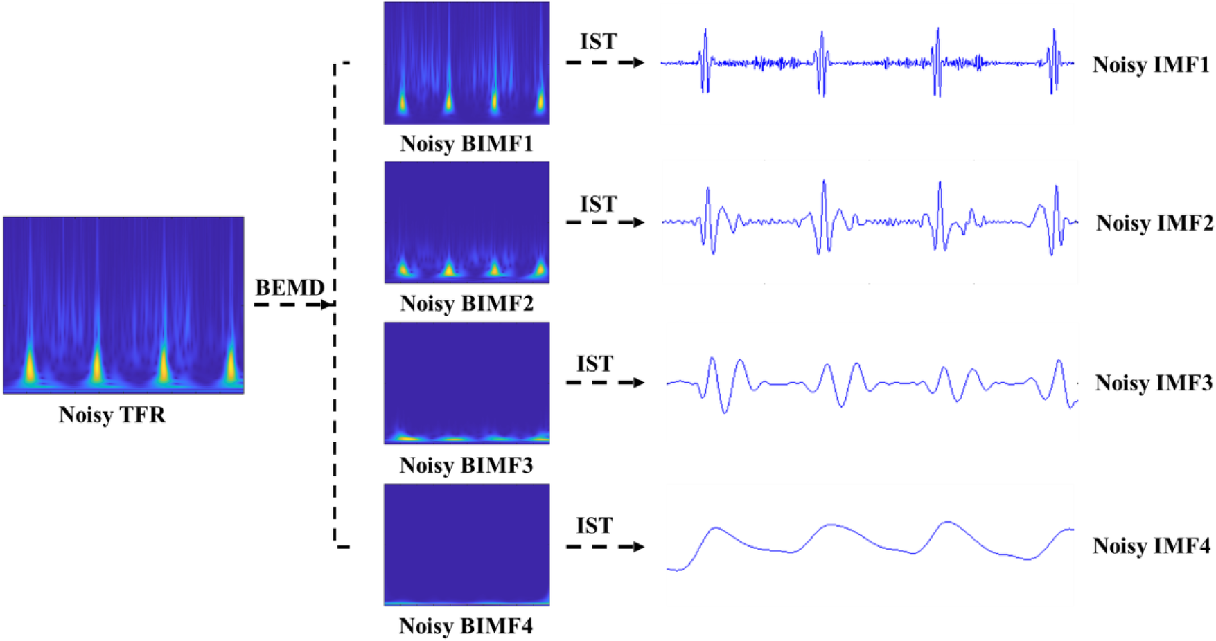 The BEMD decomposition results are depicted in Figure 4. It can be clearly seen that a noisy time-frequency signal is decomposed into four BIMFs by BEMD algorithm, and the contents of frequency gradually decrease from BIMF1 to BIMF4. Then, we perform the IST on the noisy BIMFs to obtain the noisy time-domain IMFs. Similarly, the frequencies of time-domain IMFs are also gradually reduced from IMF1 to IMF4. Figure 5 shows the denoised BIMFs by the NLM filtering. The comparison between the noisy BIMFs and the denoised BIMFs indicates that most of noise has been successfully removed and the time-frequency energy is more concentrated. Also, we perform the IST on the denoised BIMFs and obtain the denoised time-domain IMFs. Compared with the noisy IMFs, the denoised IMFs are smoother, and ECG characteristics are significantly highlighted.