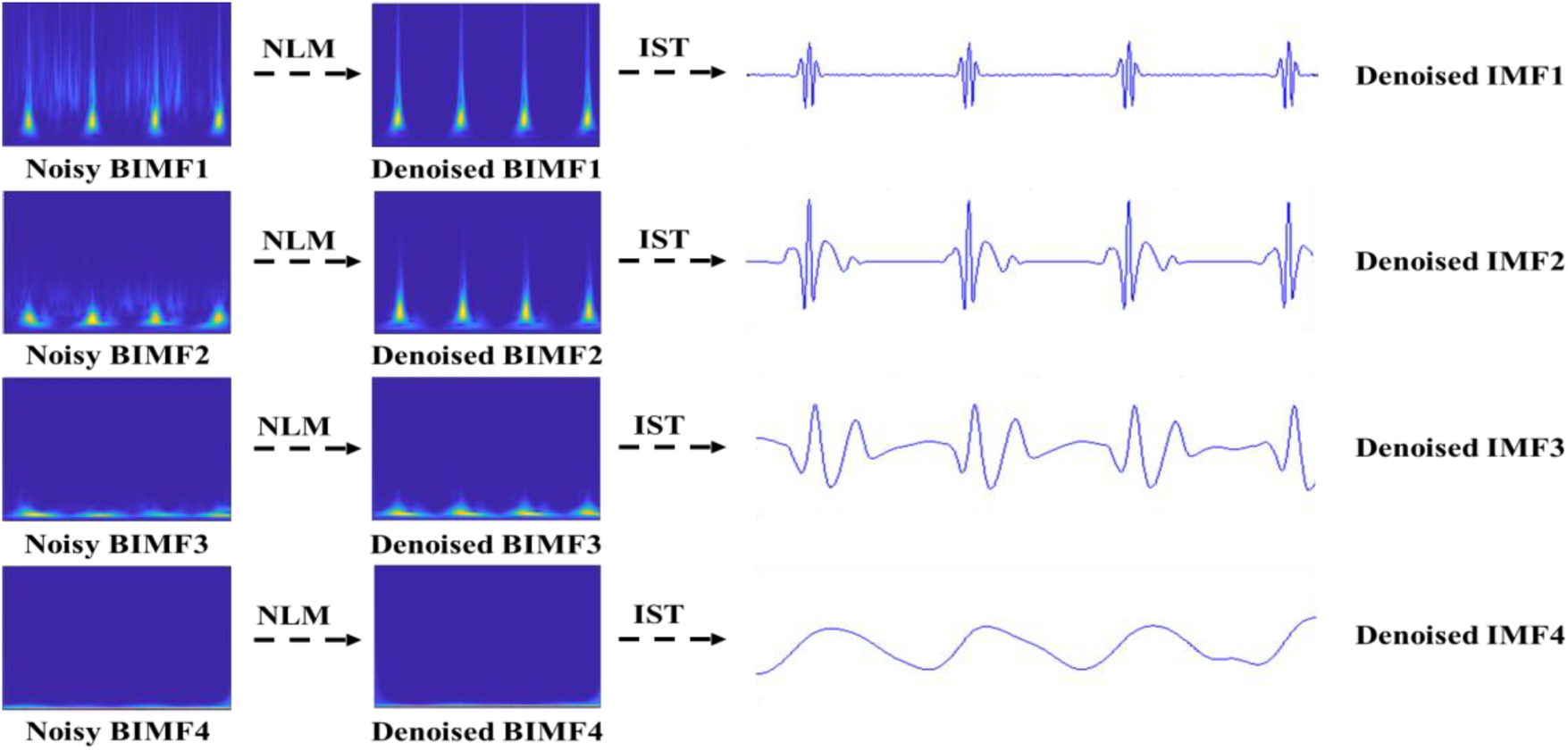 Non-local means (NLM) filtering (29), originally proposed for image denoising (30), is a popular denoising algorithm, and it has been widely applied for noise removal in ECG signals. The key of the NIM algorithm is based on the self-similarity of the image. It estimates the value of the current pixel in the image by taking a weighted average of surrounding pixels with similar neighborhood structure. In fact, the time-frequency map reflects the evolution of signal energy over time and frequency, and the energy density between adjacent samples has a certain similarity. Therefore, the characteristics of time-frequency map are consistent with the one of the image required by NLM. In this study, the BIMFs are filtered by NLM to remove the noise at different scales.