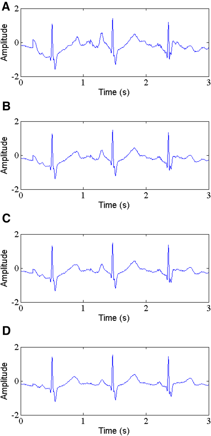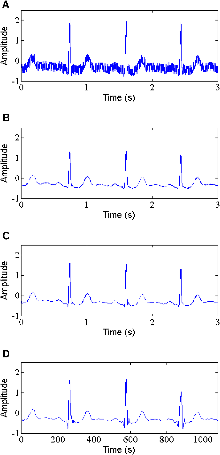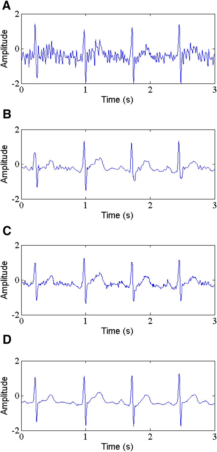 Power line interference removal, (A) noisy signal, (B) denoised signal by WT, (C) denoised signal by NLM, (D) denoised signal by the proposed method.