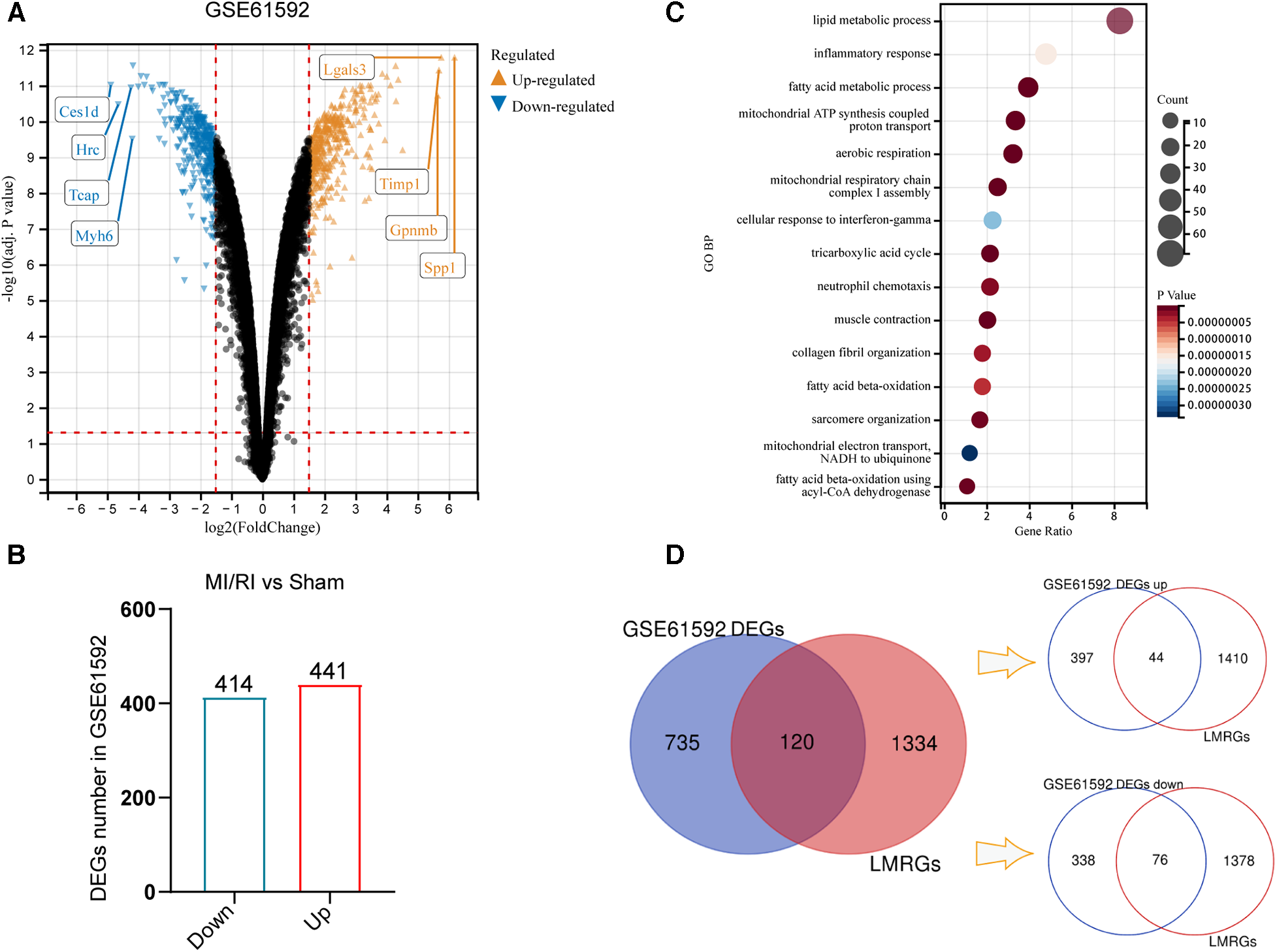 Identification of differentially expressed genes and differentially expressed LMRGs in myocardial ischemia-reperfusion injury. (A) The volcano plot of differential expression analysis for GSE61592. (B) DEGs number in GSE61592. (C) The Bubble plot of GO BP analysis results for DEGs in GSE61592. (D) Venn diagram for the identification of differentially expressed LMRGs.