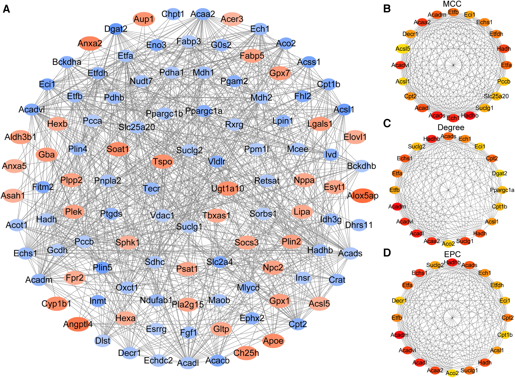 Construction of the protein-protein interaction network and identification of key genes. (A) The whole PPI Network of differentially expressed LMRGs. (B) Prediction results of the MCC algorithm. (C) Prediction results of the Degree algorithm. (D) Prediction results of the EPC algorithm.