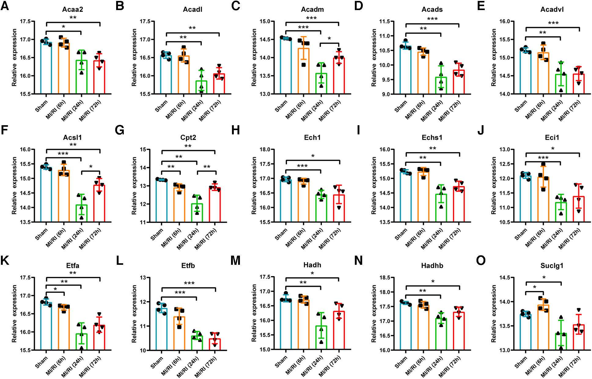 Validation of key LMRGs in the mouse myocardial ischemia-reperfusion injury related dataset GSE160516. (A–O) Validation of 15 key LMRGs Acaa2, Acadl, Acadm, Acads, Acadvl, Acsl1, Cpt2, Ech1, Echs1, Eci1, Etfa, Etfb, Hadh, Hadhb, and Suclg1 at 6 h, 24 h, and 72 h of reperfusion in GSE160516. i = 4 for each group. For panels (A–O) *P < 0.05, **P < 0.01, ***P < 0.001.