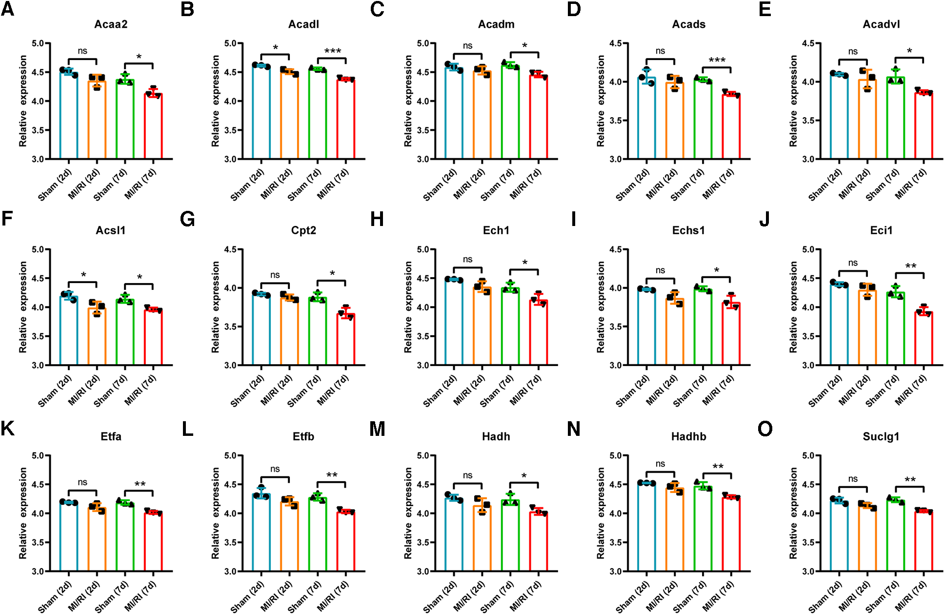 Validation of the identified key LMRGs in H9C2 cell hypoxia-reoxygenation model. (A–O) Validation of 15 key LMRGs Acaa2, Acadl, Acadm, Acads, Acadvl, Acsl1, Cpt2, Ech1, Echs1, Eci1, Etfa, Etfb, Hadh, Hadhb, and Suclg1 in the H9C2 cell H/R model. n = 3 for each group. For panels (A–O), ns indicates no statistical difference; *P < 0.05, **P < 0.01, ***P < 0.001.