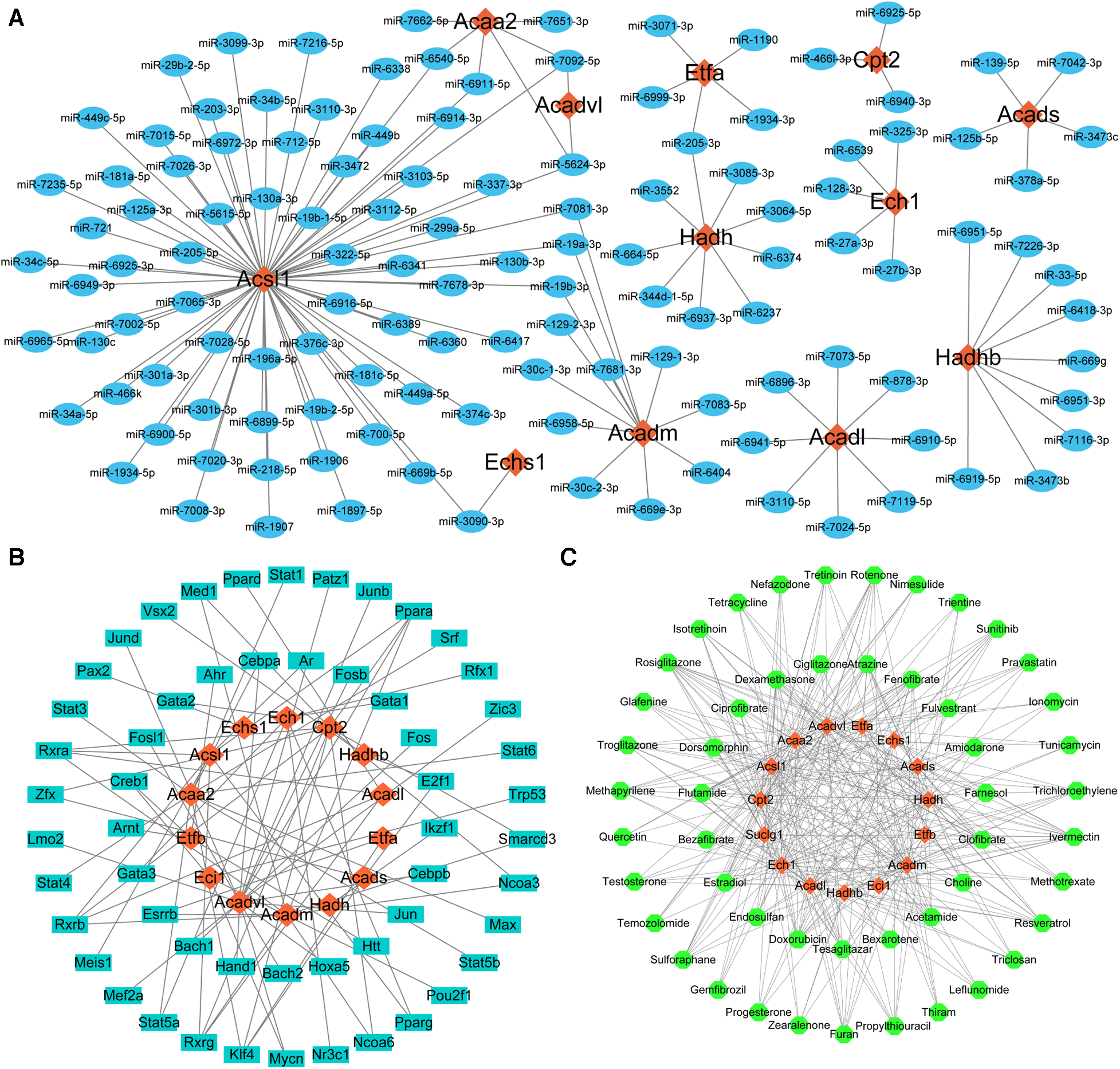 Prediction of key LMRGs-related miRNAs, transcription factors, and therapeutic agents. (A) The whole miRNA-mRNA regulatory network. (B) The whole TF-mRNA regulatory network. (C) The whole agent-mRNA regulatory network. For panels (A–C) The orange-red diamond nodes represent key LMRGs; the blue oval nodes represent miRNAs; the cyan oblong nodes represent TFs; the green circular nodes represent therapeutic agents.