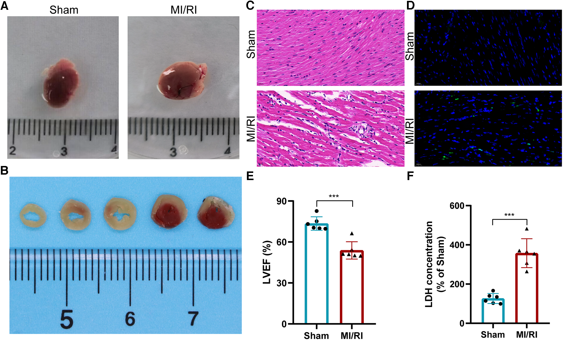 Establishment and evaluation of the mouse myocardial ischemia-reperfusion injury model. (A) Appearance of the heart. (B) TTC staining results of MI/RI model mouse heart. (C–F) HE staining (C), Tunel staining (D), LVEF detection (E), and serum LDH detection (F) results in the MI/RI model group and sham operation group. For panels (E,F), ***P < 0.001.
