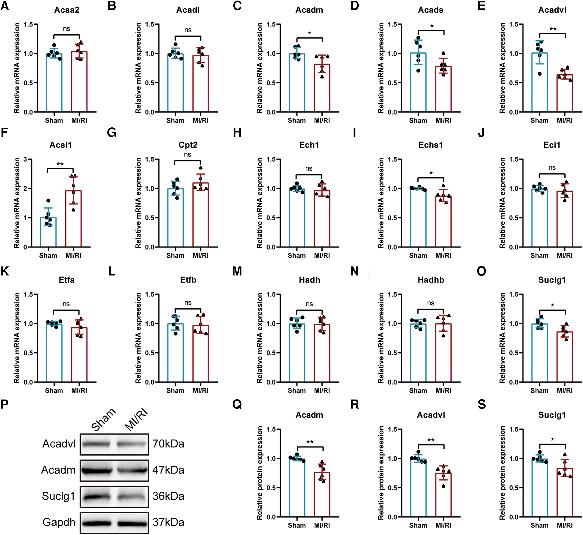 Further validation of the identified key LMRGs in mouse myocardial ischemia-reperfusion injury model. (A–O) Validation of 15 key LMRGs Acaa2, Acadl, Acadm, Acads, Acadvl, Acsl1, Cpt2, Ech1, Echs1, Eci1, Etfa, Etfb, Hadh, Hadhb, and Suclg1 in the mouse MI/RI model. n = 6 for each group. (P–S) Western blotting experiments detected the protein expression of Acadm, Acadvl, and Suclg1 in the mouse MI/RI model. For panels (A–O, Q-S), ns indicates no statistical difference; *P < 0.05, **P < 0.01.