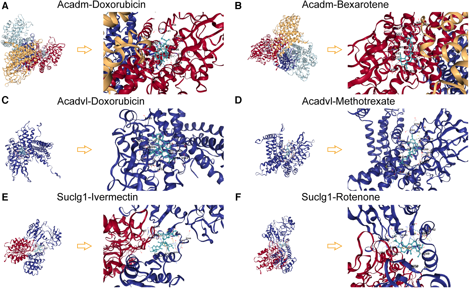 Molecular docking patterns of key LMRGs and therapeutic agents. (A) Molecular docking mode diagram of Acadm and Doxorubicin. (B) Molecular docking mode diagram of Acadm and Bexarotene. (C) Molecular docking mode diagram of Acadvl and Doxorubicin. (D) Molecular docking mode diagram of Acadvl and Methotrexate. (E) Molecular docking mode diagram of Suclg1 and Ivermectin. (F) Molecular docking mode diagram of Suclg1 and Rotenone.