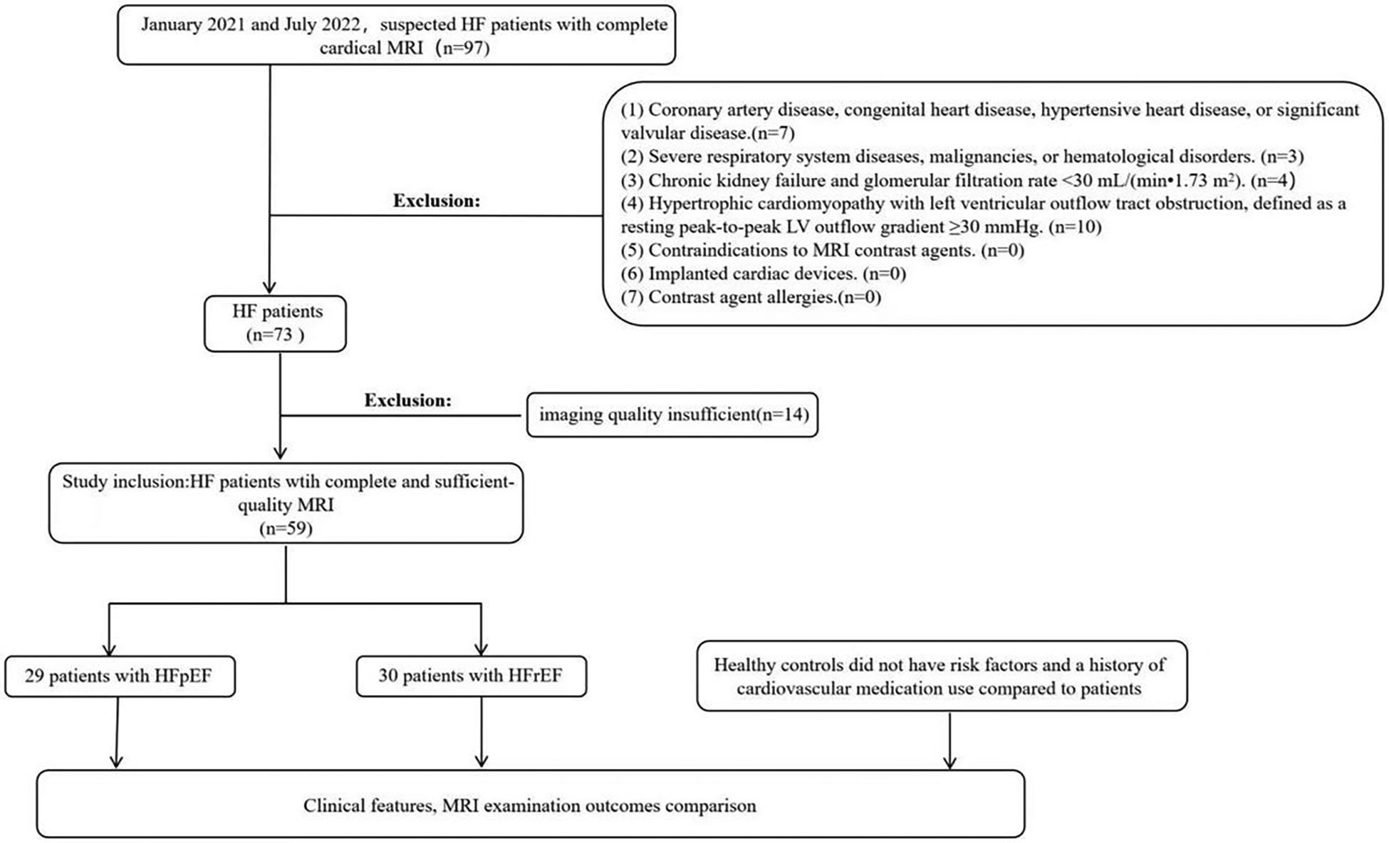 2). (4) Patients with hypertrophic cardiomyopathy with left ventricular outflow tract obstruction, defined as a resting peak-to-peak LV outflow gradient ≥30 mmHg. (5) Patients with contraindications to MRI contrast agents. (6) Patients with implanted cardiac devices. (7) Patients with contrast agent allergies. (