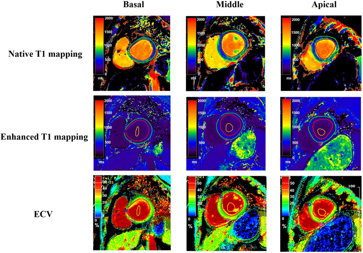 T1 mapping and ECV quantification in left ventricular segmentation. This figure displays T1 mapping in the basal (left column), mid-ventricular (middle column), and apical (right column) short-axis segments of the left ventricle from a single patient. The top row illustrates native T1 maps, the middle row shows post-contrast T1 maps, and the bottom row depicts the calculated extracellular volume (ECV) maps for corresponding segments. The red region of interest represents the epicardium, the green region of interest represents the endocardium, and the orange region of interest represents the blood pool.