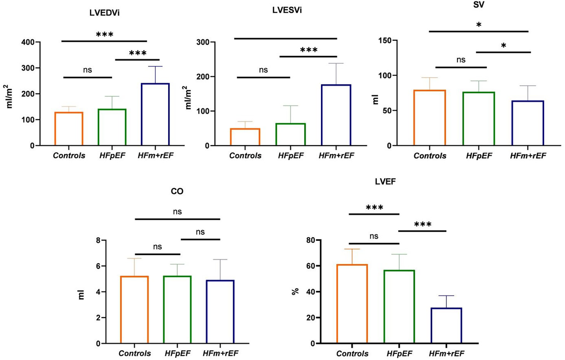 Group-Wise comparison of CMR imaging metrics using Bar graphs.the bars represent the mean values for each group, and the error bars indicate the standard deviation. This bar graph depicts the collective CMR imaging metrics for healthy control, and patients diagnosed with HFpEF or HFm + rEF. Displayed metrics include LVEDVi, LVESVI and SV on the top row, LVEF and GLS on the bottom row.