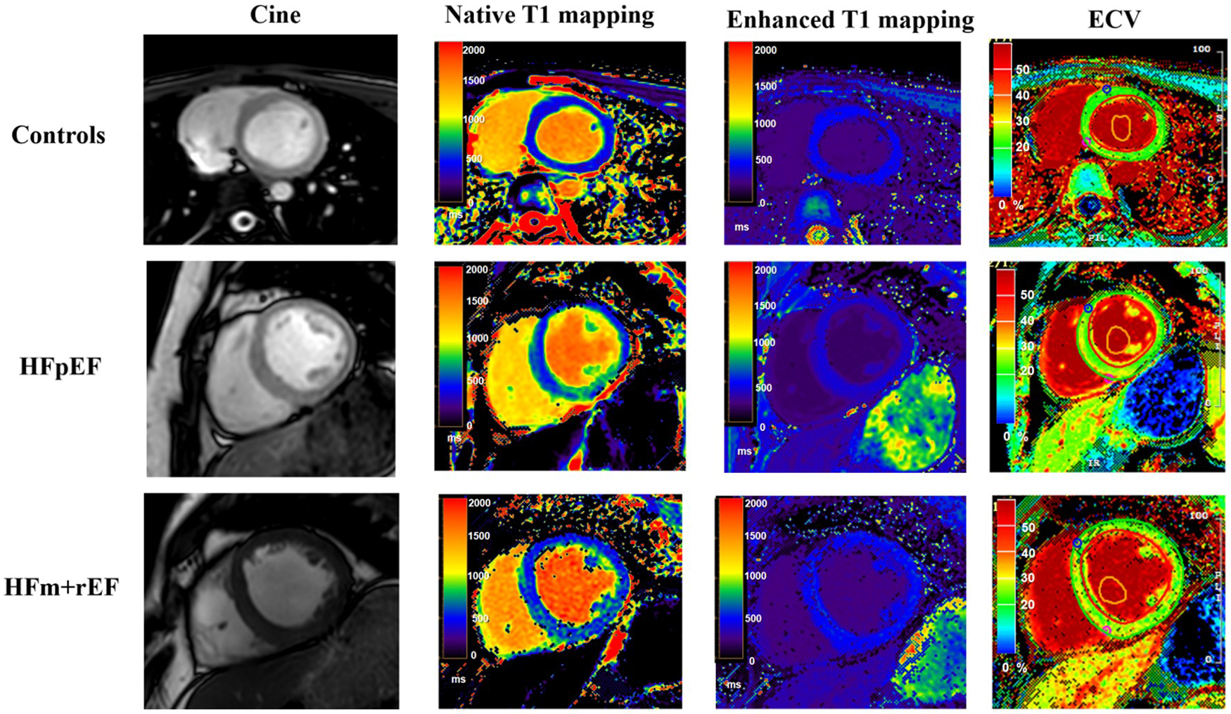 Comparative CMR imaging across patient groups. This figure presents a sequence of images for each group: control subjects, patients with Heart Failure with Preserved Ejection Fraction (HFpEF), and patients with Heart Failure with mid-range and reduced Ejection Fraction (HFm + rEF). From left to right, the images display cine, native T1 mapping, enhanced T1 mapping, and extracellular volume (ECV) measurement. The top row illustrates the control group, followed by the HFpEF patients in the middle row, and the HFm + rEF patients in the bottom row.