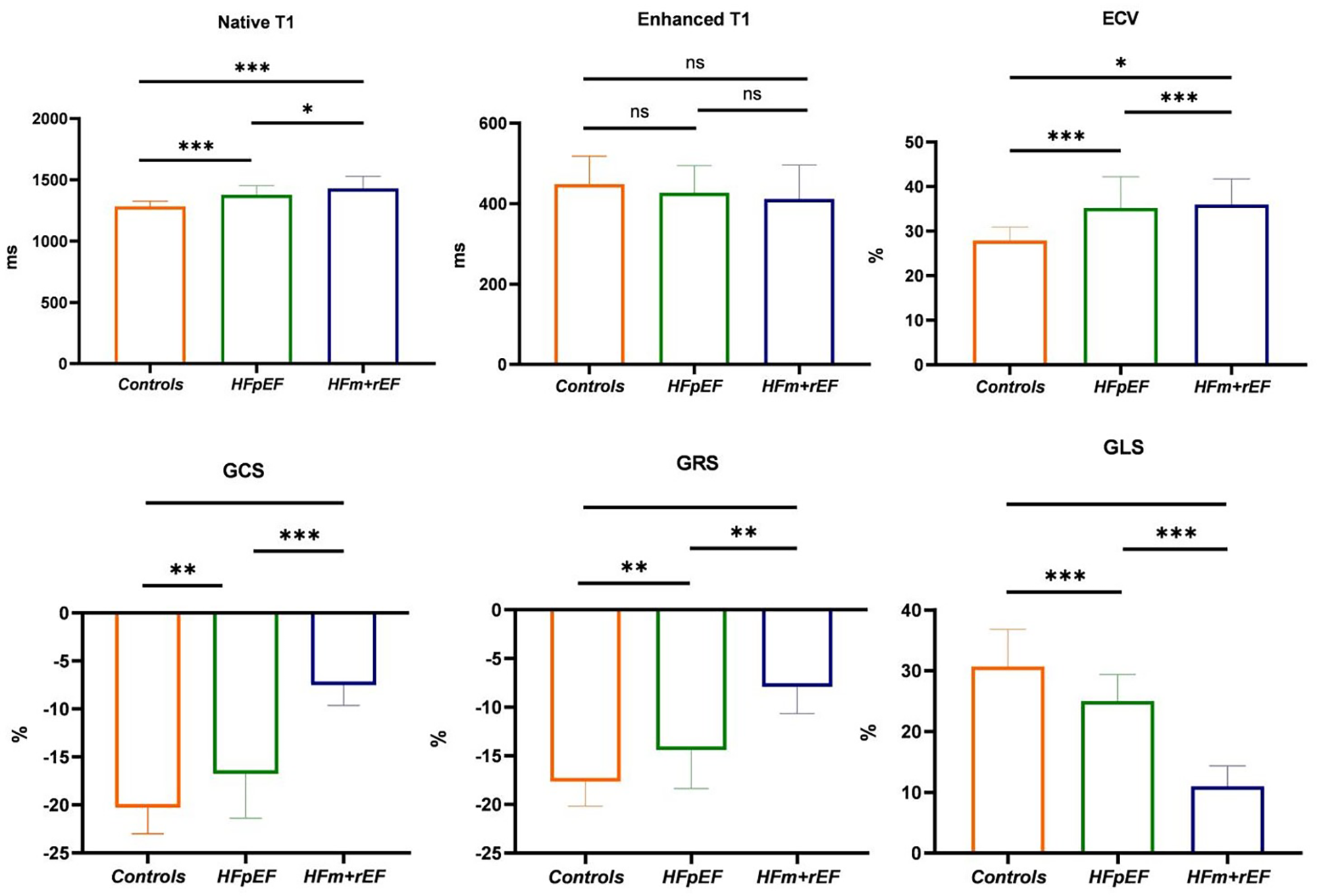 HFpEF, heart failure with preserved ejection fraction; HFm + rEF, heart failure with mid-ranged and reduced ejection fraction; LVEDVi, left ventricular end-diastolic volume index; LVESVi, left ventricular end-systolic volume index; SV, stroke volume; CO, cardiac output; LVEF, left ventricular ejection fraction; LVMi, left ventricular mass index; ECV, extracellular volume; GCS, global circumferential strain; GRS, global radial strain; GLS, global longitudinal strain.