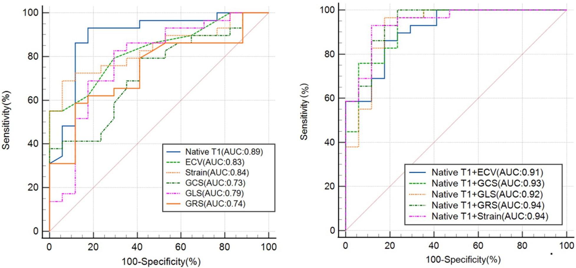 Native T1, ECV, and myocardial strain parameters have substantial diagnostic value in identifying HFpEF. Among them, native T1 displayed superior diagnostic efficiency relative to ECV, offering critical insights into early-stage HFpEF. These findings can play a pivotal role in refining clinical management and treatment strategies for heart failure patients.