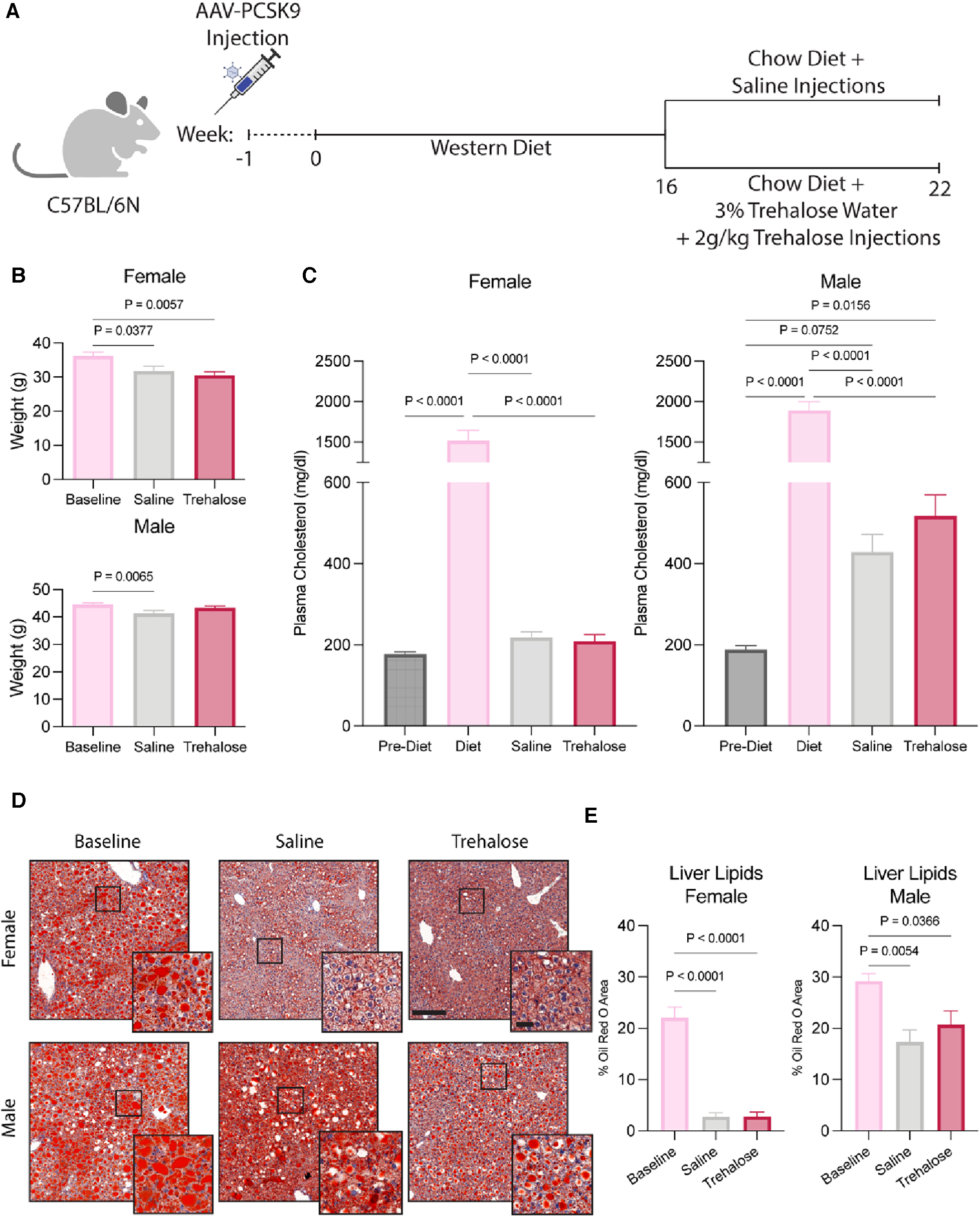 Trehalose does not alter body composition or circulating cholesterol. (A), Schematic of the experimental design. (B) Body weight of female and male mice during the 6 weeks of chow diet feeding (n = 10–11 males; n = 12 females). (C) Plasma cholesterol taken 1 week post AAV-PCSK9 injections, during Western Diet feeding and after 6 weeks of chow diet feeding (n = 10 males; n = 12 females). (D,E) Representative images and quantification of livers stained by Oil Red O (n = 4–5 males; n = 4–6 females). Scale bar = 200 µm and 50 µm in zoomed-in images. Statistical significance was assessed with a one-way ANOVA with a Holm-Sidak's post hoc test for multiple comparisons correction when comparing more than two groups.