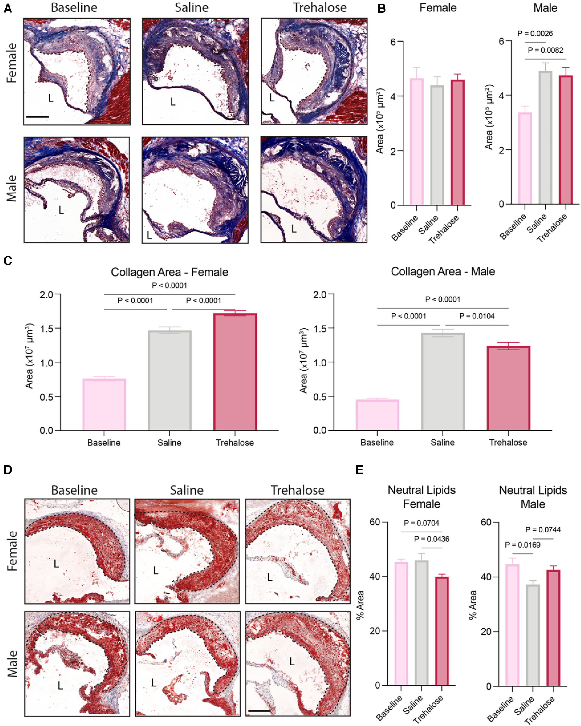 Trehalose promotes plaque stabilization in female mice. (A) Representative micrographs of aortic root stained with Masson Trichrome. (n = 8–11 males; n = 10–12 females). Scale bar = 200 µm. L = Lumen. (B) Quantification of atherosclerotic lesion area in the aortic root. (C) Quantification of the total collagen area throughout the aortic root (area under the curve) as quantified by the blue stain of Masson Trichrome. (D) Representative micrographs of aortic root stained with Oil Red O. Scale bar = 200 µm. L = Lumen. (E) Quantification of the percentage of the neutral lipid content of the total plaque area (n = 9–10 males; n = 10–12 females). Statistical significance was assessed using a one-way ANOVA with Holm-Sidak's post hoc test for multiple comparison correction when comparing more than two groups.